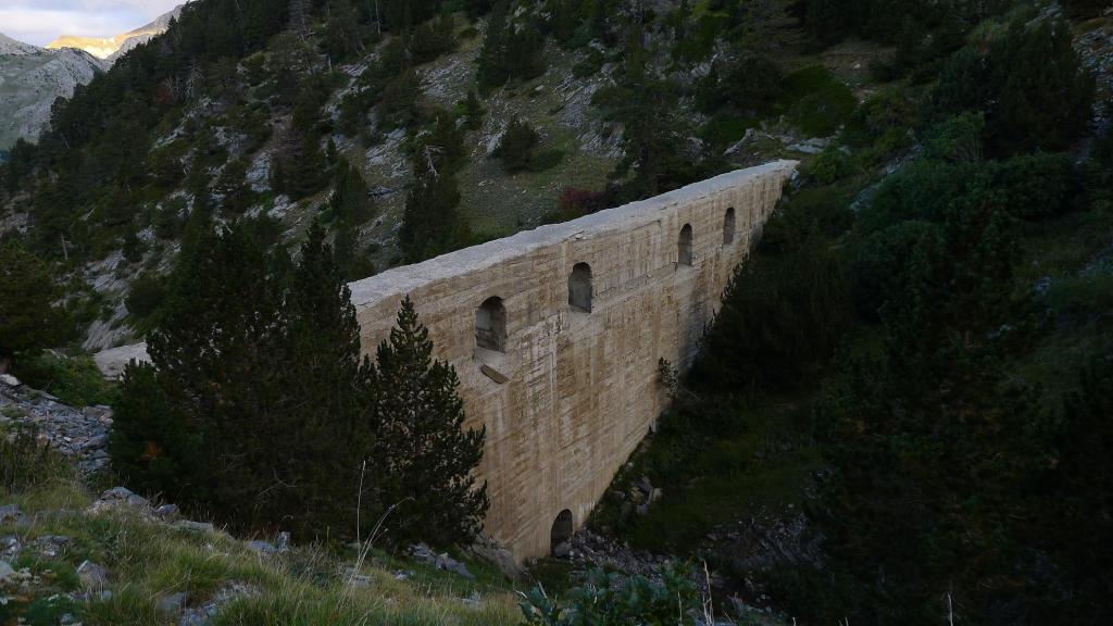 Tomo un atajo de la pista (1505m 0h13′), con senda bien marcada por hitos, y sucesivos atajos cruzan la pista. Subiendo hacia el norte y NE se llega a un entronque de caminos (1811m 0h49′) donde sigo hacia la izquierda. Finalmente sigo la pista (1870m 0h56′) a la izquierda durante unos metros, junto a la pared rocosa a mi derecha, hasta encontrar el barranco Sanchacollons (1930m 1h05′) cruzado por un muro de regulación del caudal.