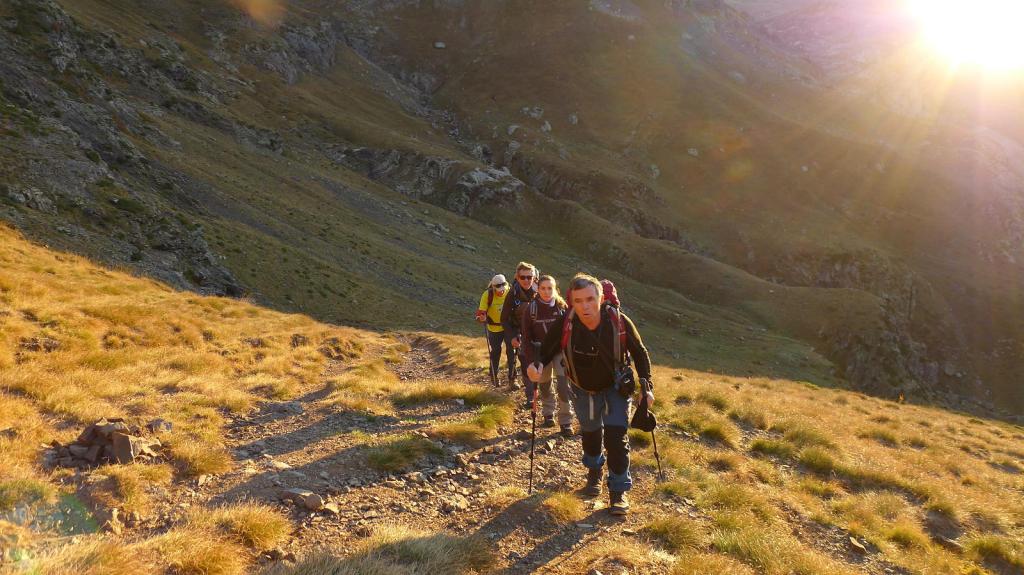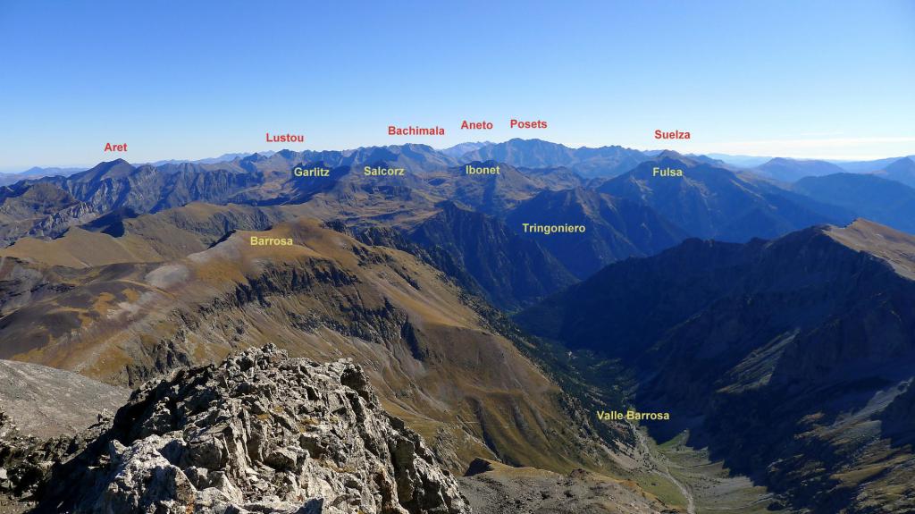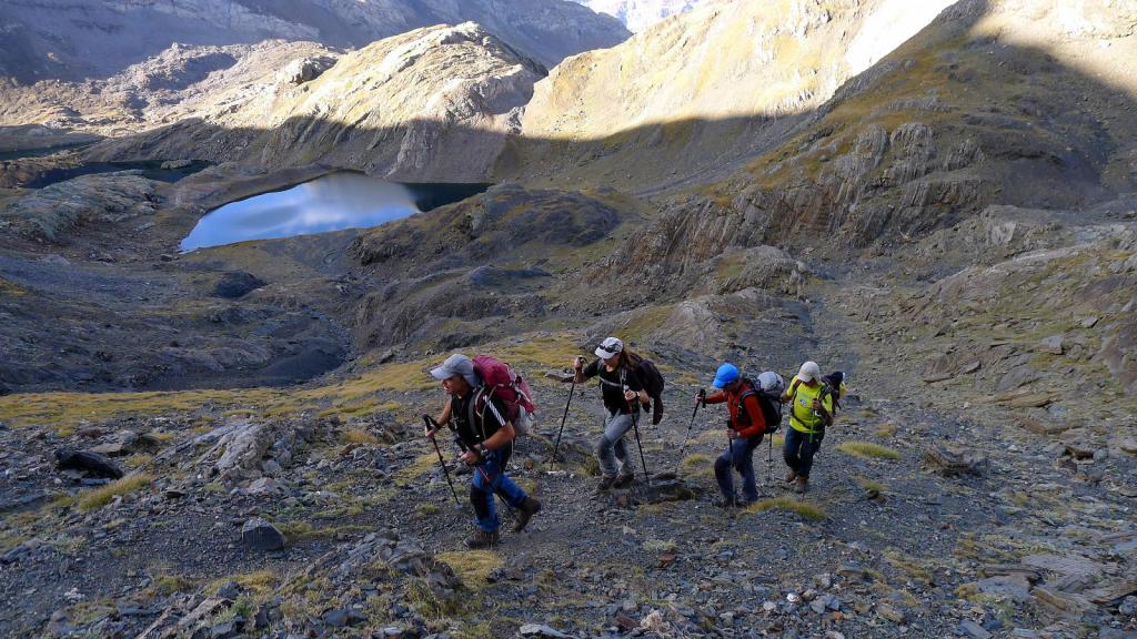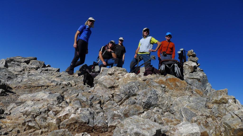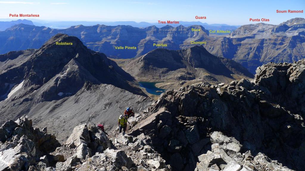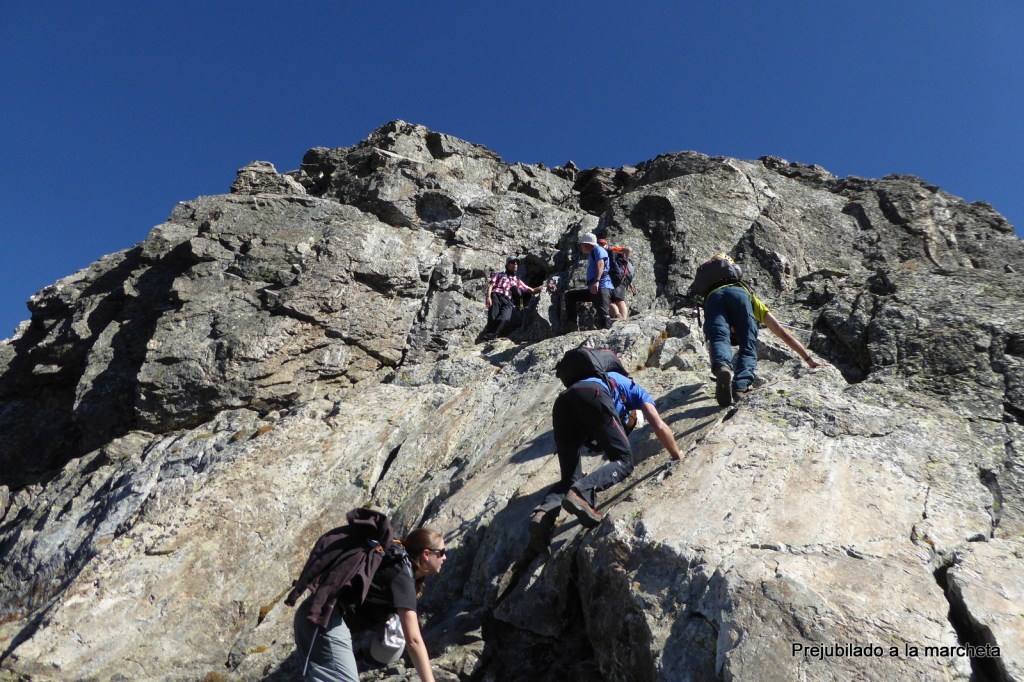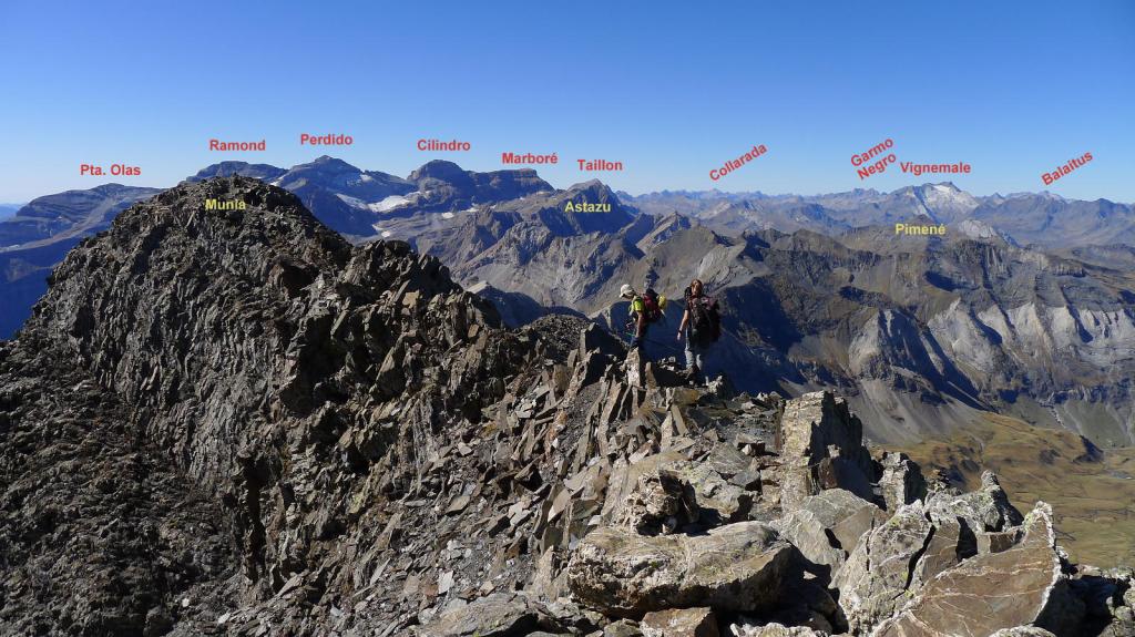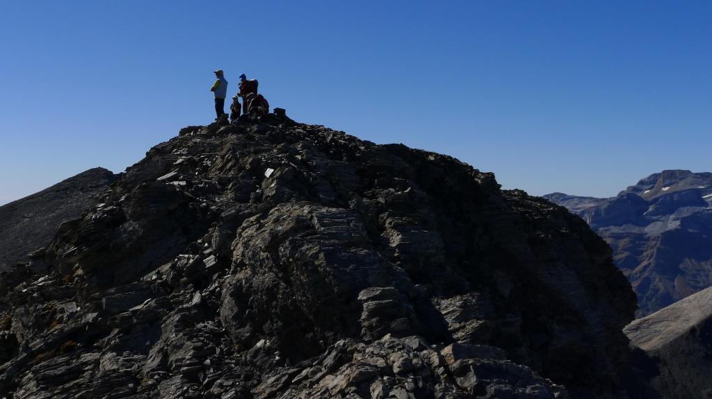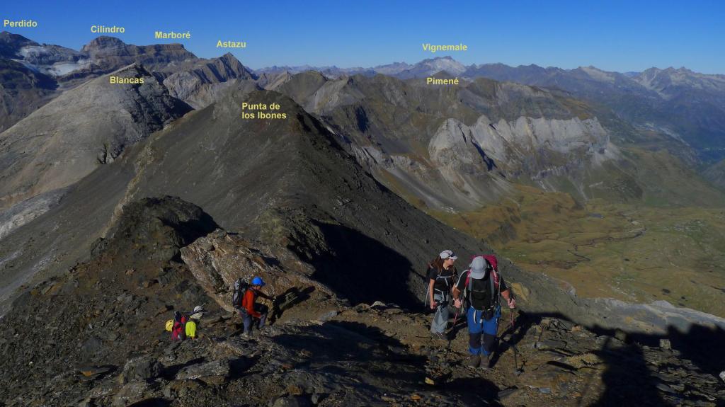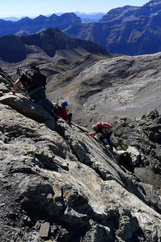 De vuelta a la Munia (3133m 5h23′) afrontamos el descenso del Paso del Gato donde nos ayudamos un poco indicando los de abajo dónde apoyar el pie a los que están en plena faena. A partir de ahí el regreso no presenta problemas hasta el aparcamiento (1914m 8h15′)