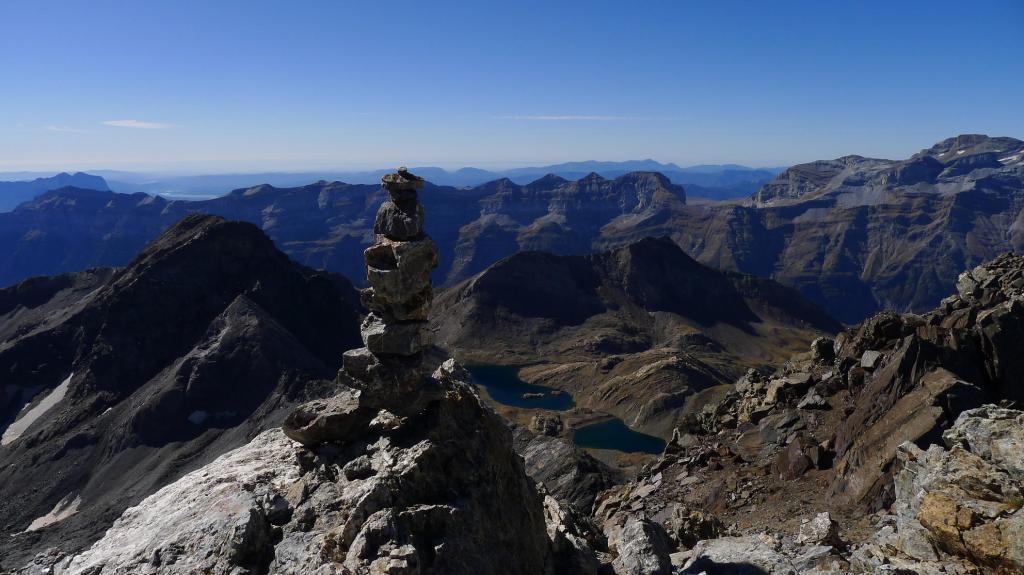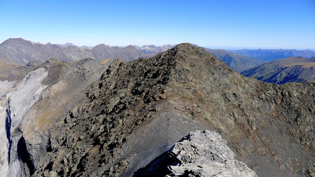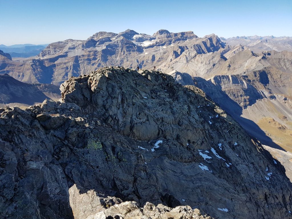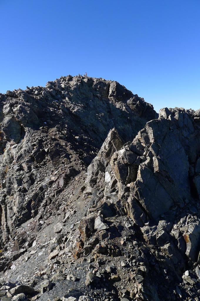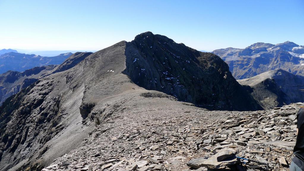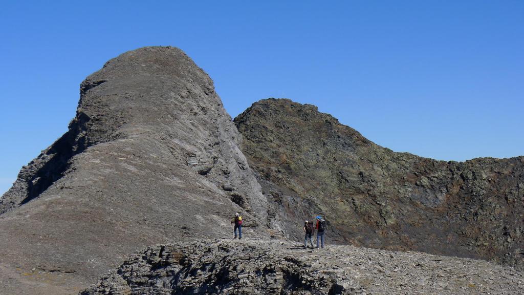 De momento la cresta es sencilla y suave. Seguiremos siempre los hitos que nos llevan por las viras más fáciles. La arista se va haciendo más aguda y hay que ir buscando a derecha e izquierda flanqueos y chimeneas. El punto más técnico es el Paso del Gato (2990m 3h05′), una laja lisa de unos 3m con una grieta por la derecha que permite superarla (IIº). Recuerdo la anterior vez que subí que había una clavija para facilitar el descenso, ahora no está. Después de una cima previa se llega al pico de la Munia (3133m, 3129m según el IGN, 3h37′).
