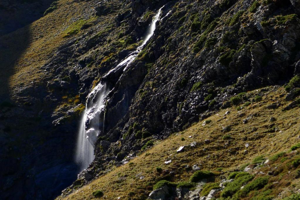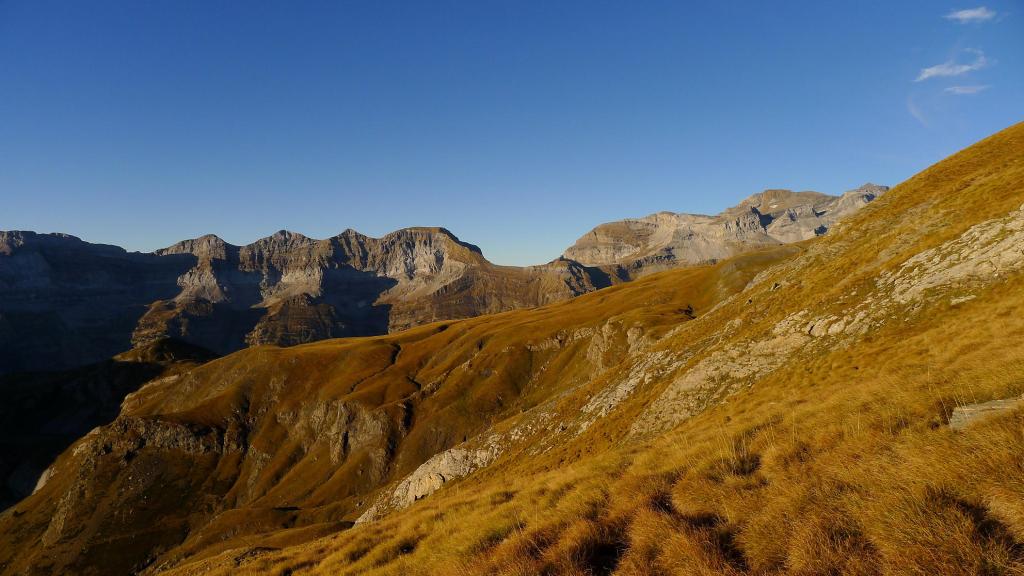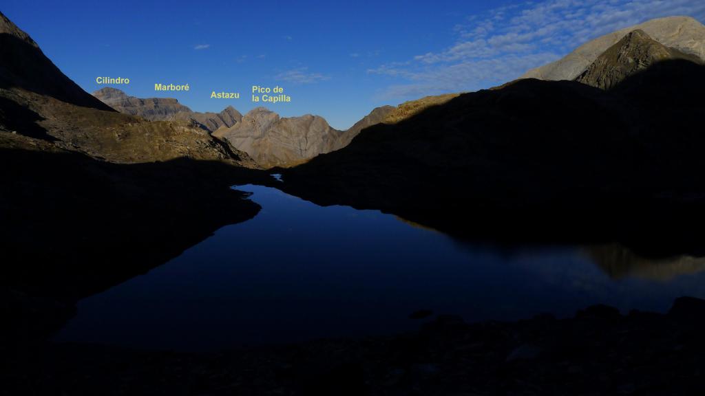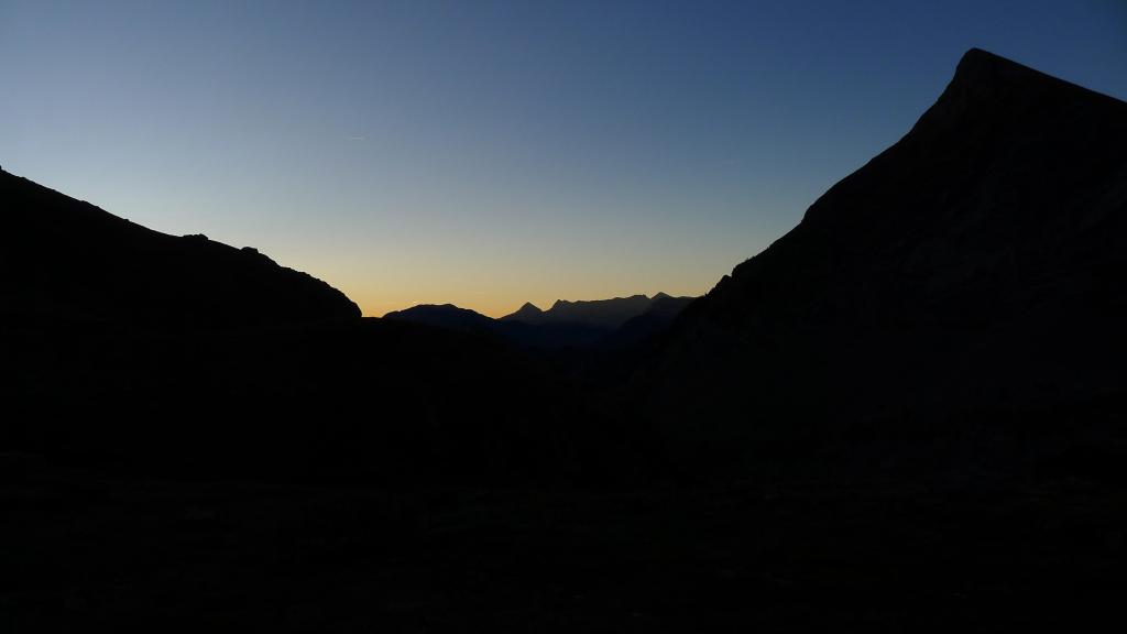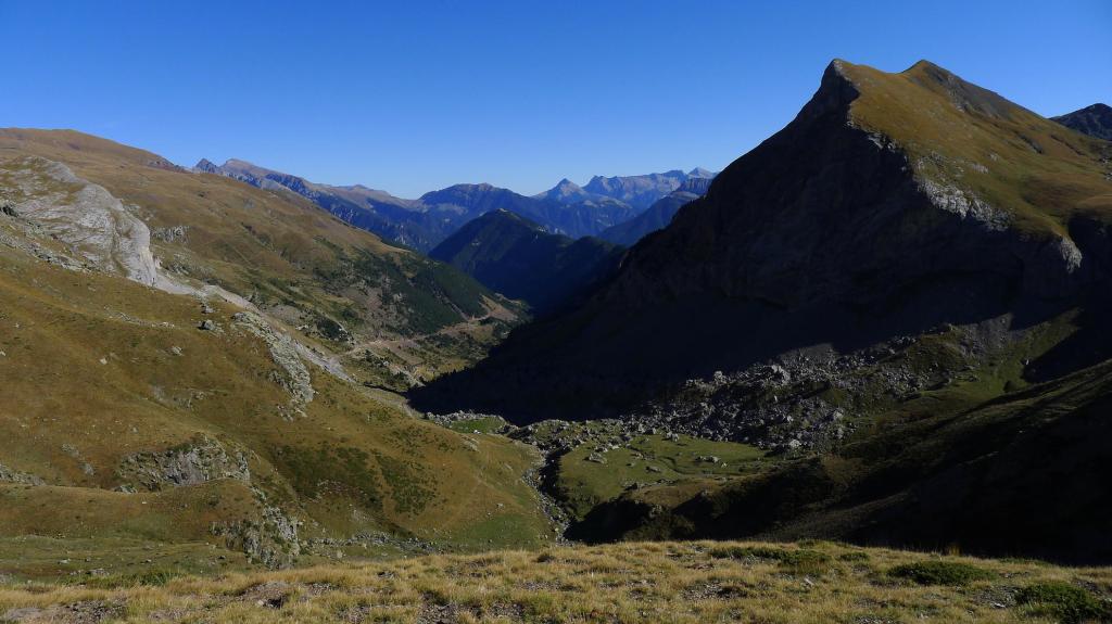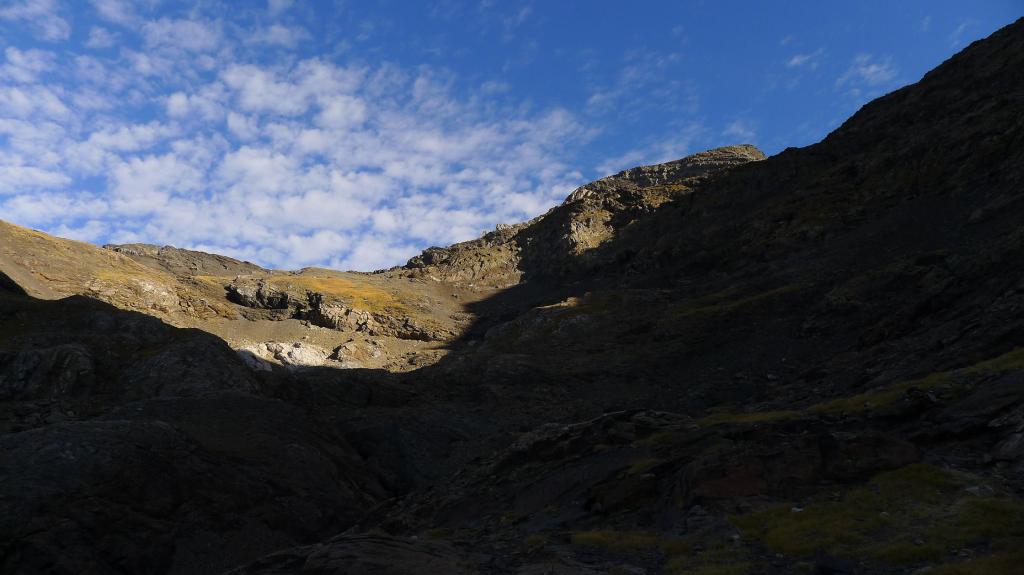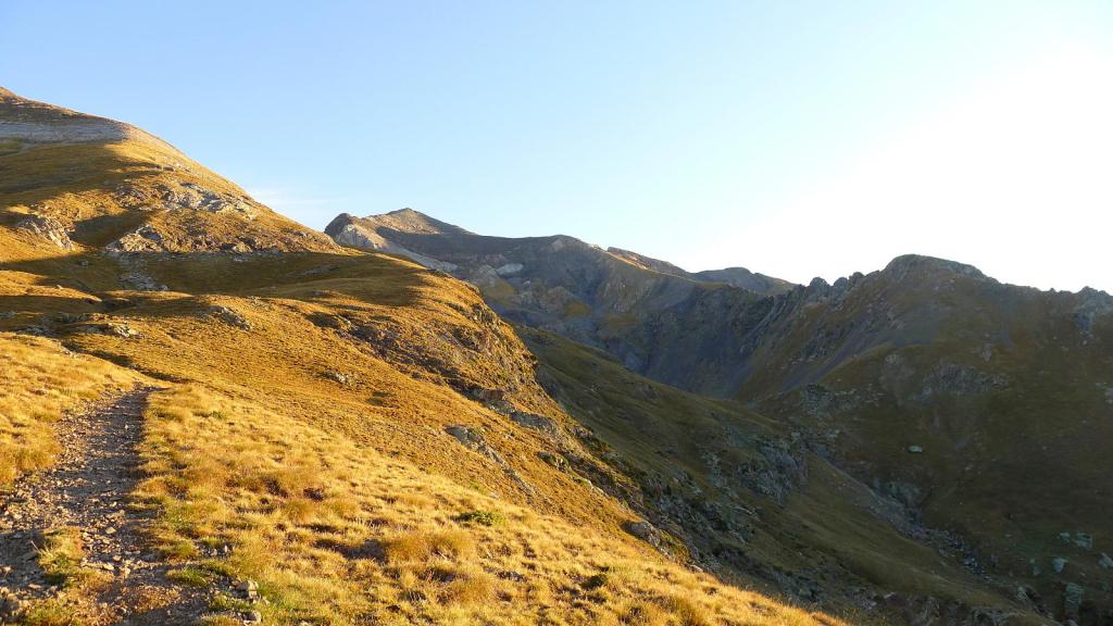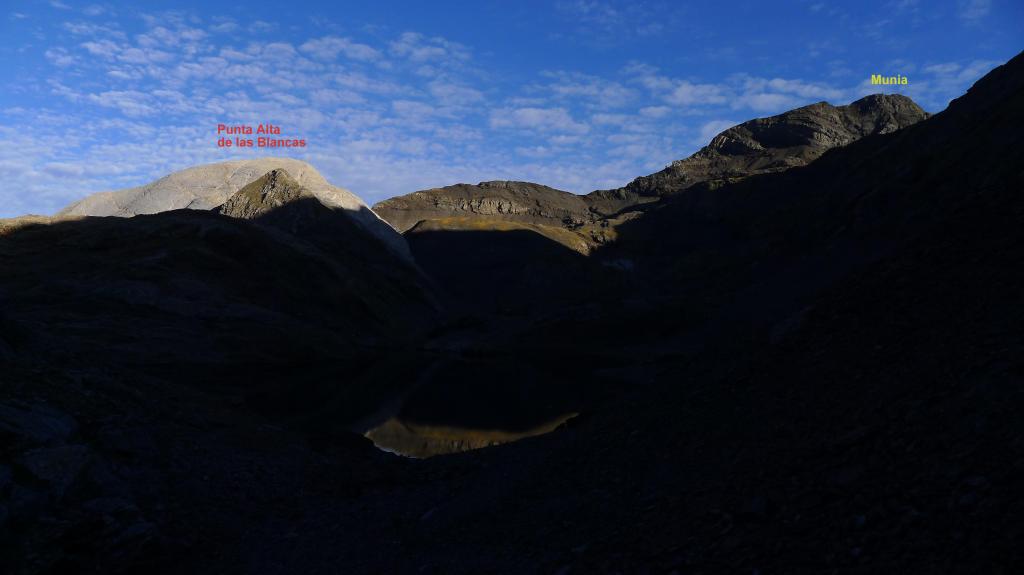 En la curva de la pista tomamos la senda a la izquierda que asciende el lomo herboso entre el barranco de Petramula y el del Clot de los Gabachos, hasta meternos en el estrechamiento (2468m 1h07′) que conduce al nacimiento de este último en el collado de las Puertas (2535m 1h23′), dando paso a la hermosa cubeta de los ibones de la Larri, todavía fresca y sombría, desde donde ya vemos el pico de las Blancas y nuestro objetivo, la Munia.