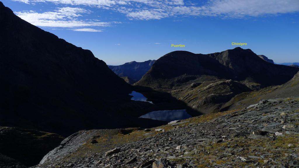 Avanzamos por la ladera de piedrilla a la derecha de los lagos, hay algún hito pero es confuso e incómodo. Al descenso iremos por una senda más clara pegada a la orilla de los lagos. Después empieza la subida más fuerte, primero a una especie de hombro junto a las Peñas del Hombre (2740m 2h16′), luego hay una bifurcación de sendas, vamos a la izquierda (2760m 2h20′) y por último alcanzamos el collado de la Munia (2853m 2h35′). Desde aquí el pico se alza como una oscura pirámide de esquisto.