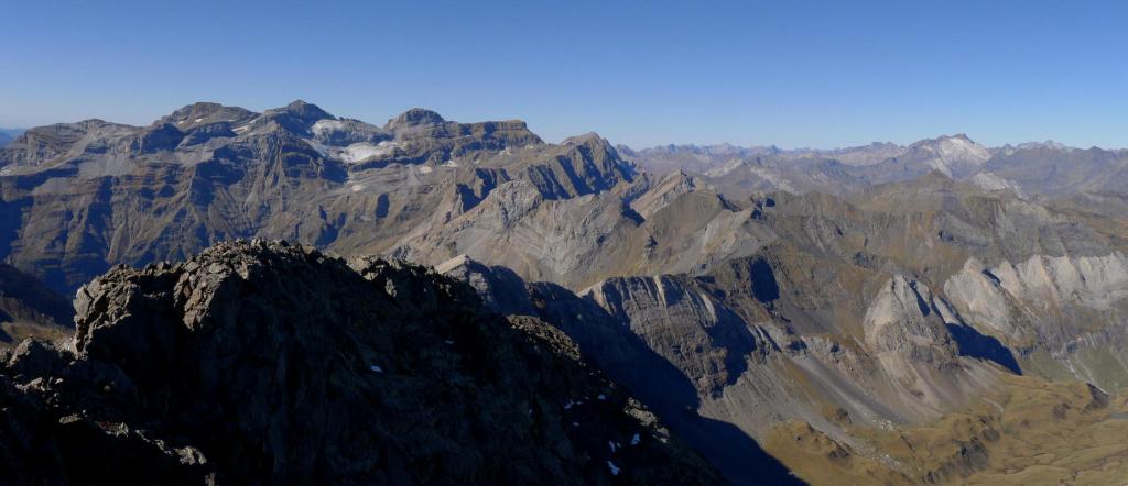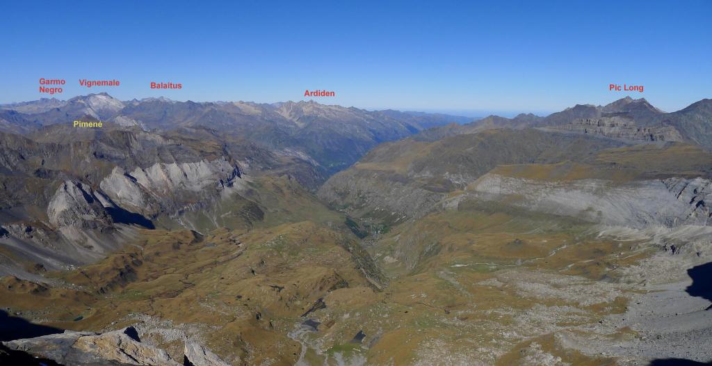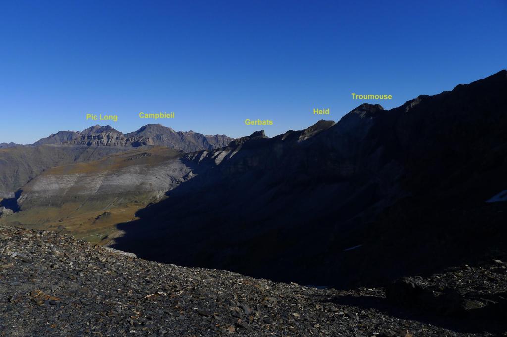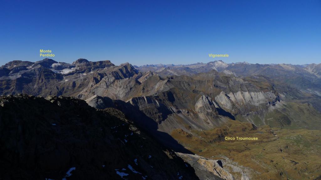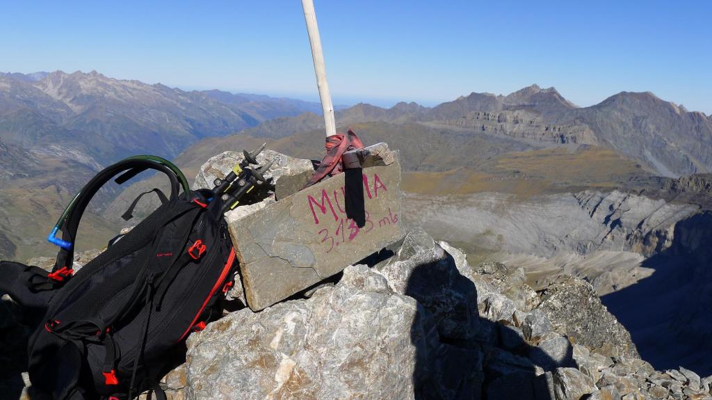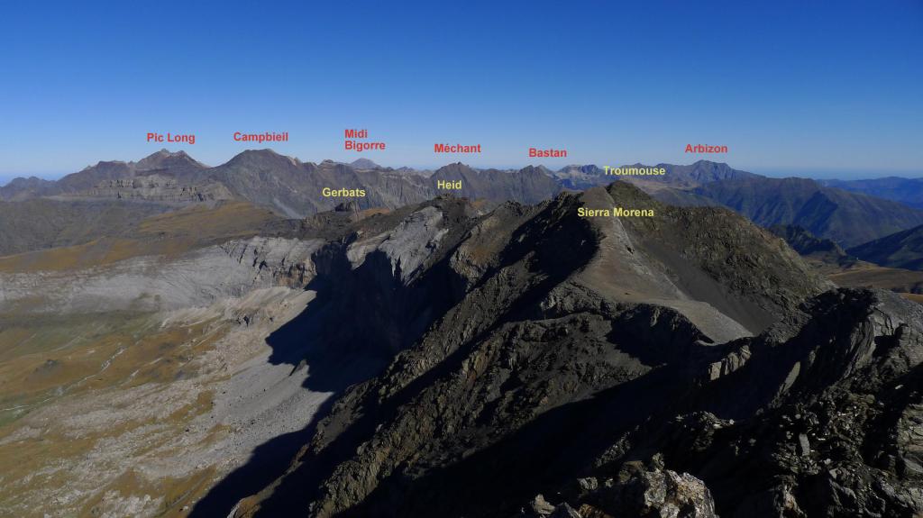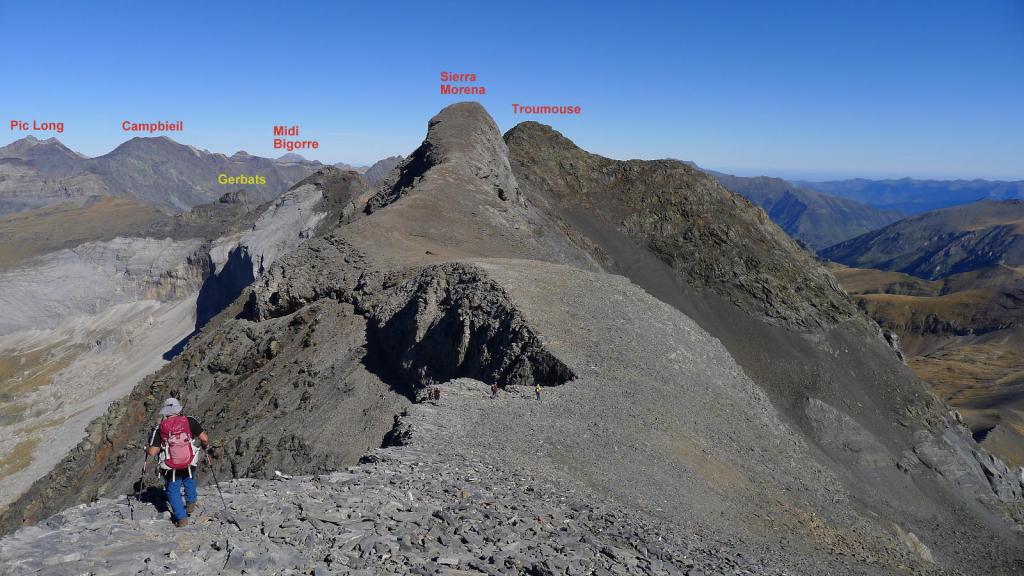 Continuamos la cresta con un ligero descenso y la subida a la Pequeña Munia (3096m, 3094 según el IGN, 4h20′), cota cuya prominencia son menos de 10m. Sigue el descenso a un collado, en el que hay una zona de vivac, y una subida muy sencilla al Sierra Morena (3090m, 3088m según el IGN,4h43′). Se ve el pico Troumouse muy cerca, pero un escalón difícil nos separa de él.