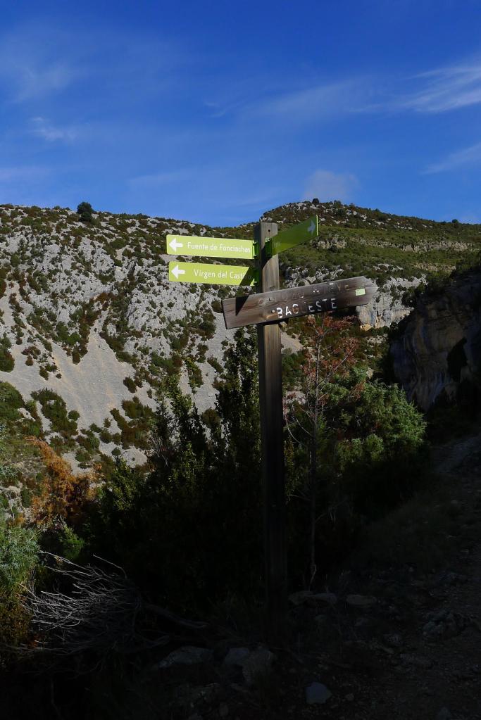 En Cheto se toma un sendero señalizado hacia la izquierda. Después habrá más bifurcaciones, todas ellas bien señalizadas. En la primera seguimos recto (833m 0h39′) y en la segunda nos vamos a la izquierda (837m 0h44′) en descenso hacia el oeste. Ya podemos ver en la gran pared de nuestra derecha la ermita casi camuflada en la roca.