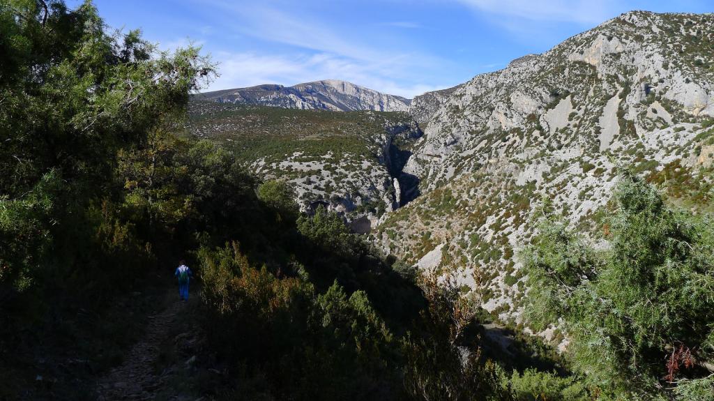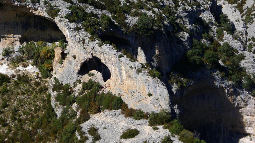 Volvemos a la última bifurcación y seguimos un buen camino junto a las paredes rocosas en las que hay grupos de escaladores y que lleva rápidamente a Rodellar (759m 2h05′) y de nuevo al aparcamiento (750m 2h12′).