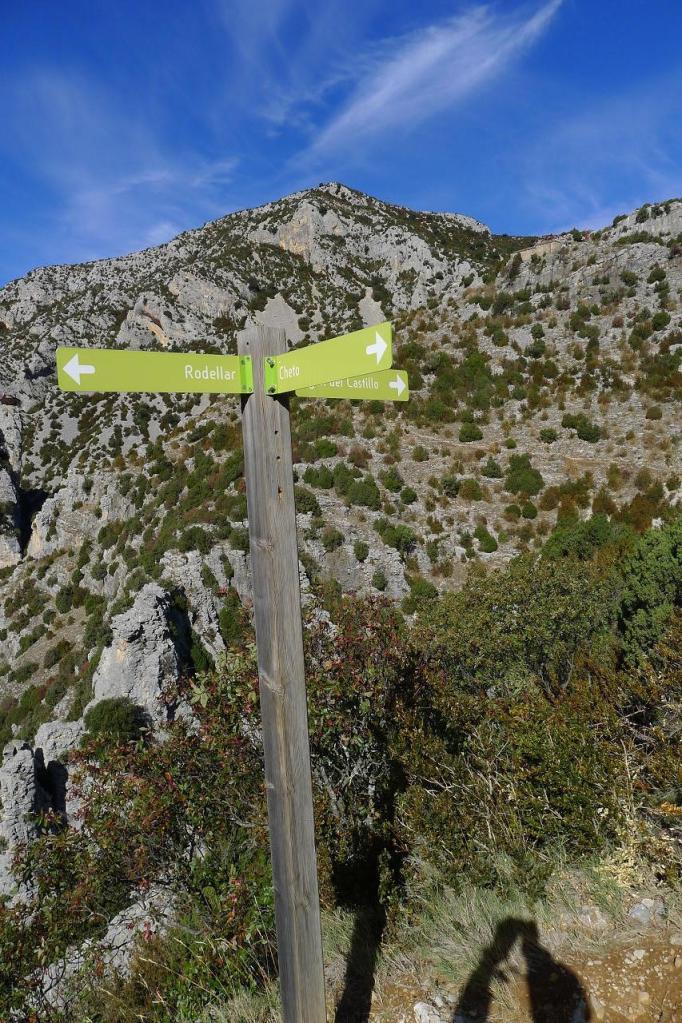 Aparcamos (750m) en la carretera antes de entrar en Rodellar, encima de un camping. Al entrar en el pueblo se toma a la derecha el camino de Cheto, pueblo abandonado al que se llega a través de un sombrío bosquete de carrasca y boj, entre muretes de piedra. (Cheto 813m 0h20′).