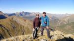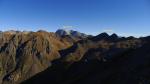 A nuestra derecha la cresta sigue como una pala de lajas pizarrosas se antoja algo difícil, pero es la única vía porque el acceso por otras zonas es mucho más vertical. Así que decidimos continuar por la pala rocosa y resulta mucho más fácil de lo que aparenta; las lajas rotas permiten siempre el agarre, teniendo cuidado de que no haya alguna suelta, y técnicamente no creo que supere ningún paso el I+. Después la cresta se estrecha pero pierde verticalidad. Llegamos al pico Escuellas (2507m 2h45′) (Peña Telera en el IGN, marcado con 2499m). El punto más alto creo que está un poco más al oeste del que marca el IGN. Hermosas vistas de los cercanos Tendeñera y Vignemale.