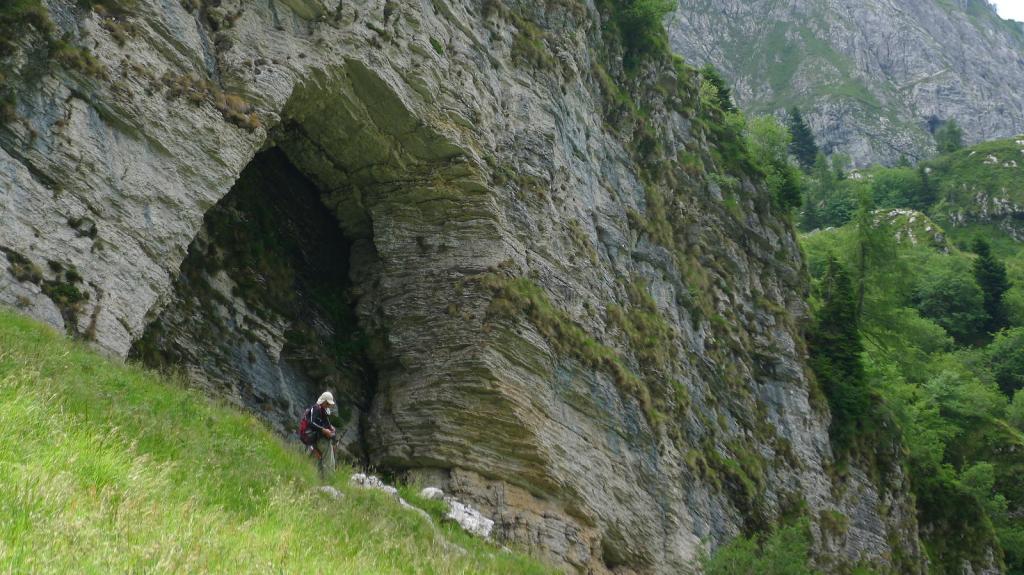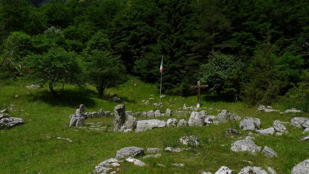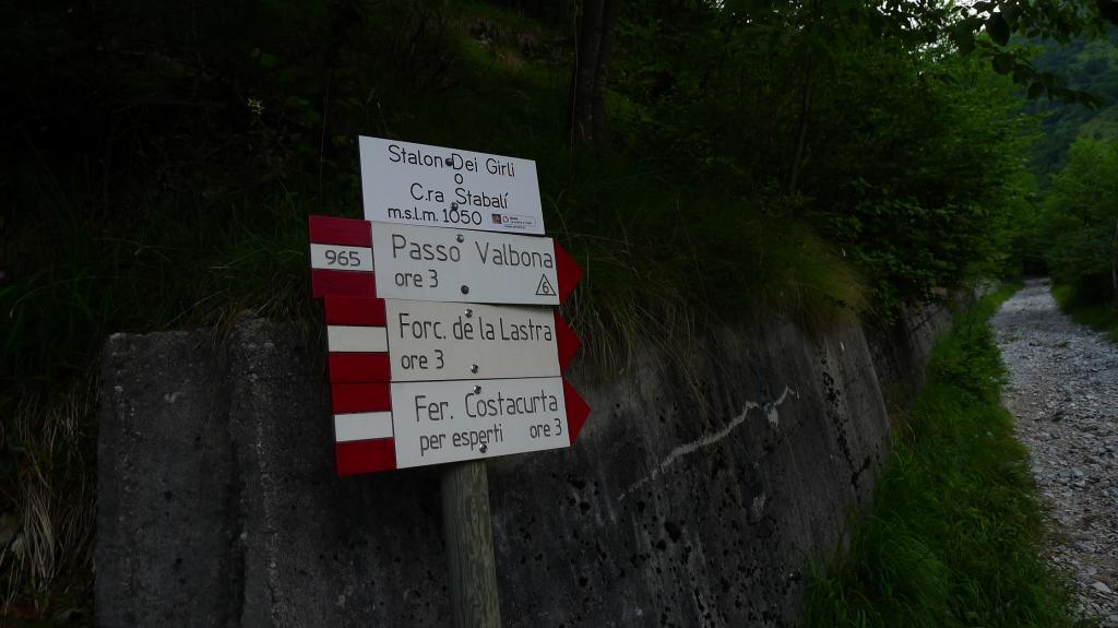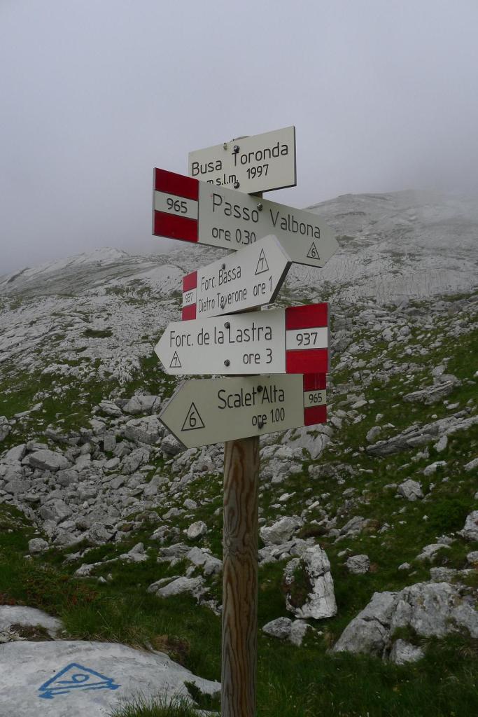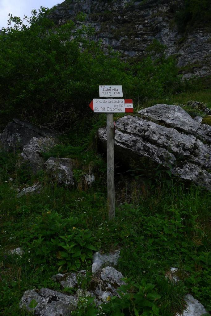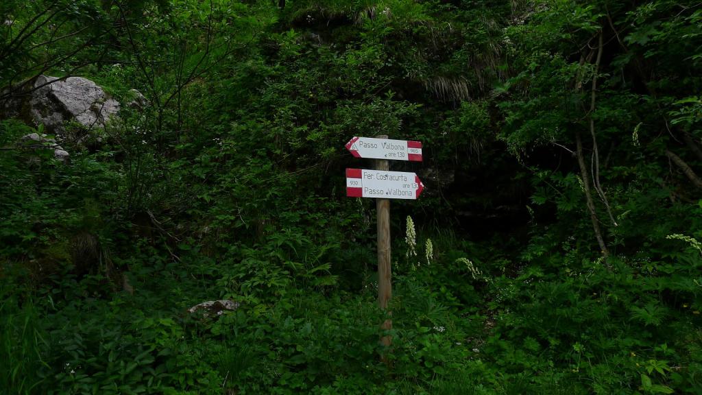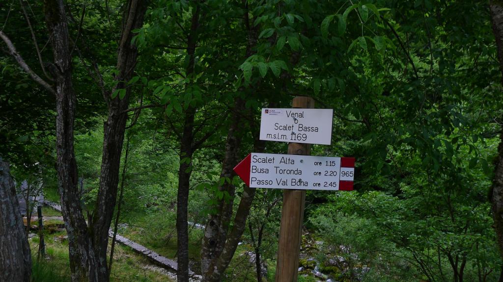 El valle se encaja, vamos pegados a la pared de nuestra derecha. Un primer cartel lo seguimos a la derecha (1565m 0h56′) y poco después otro a la izquierda en un punto marcado como Scalet Alta (1590m). Más arriba otro cartel que seguimos hacia Passo Valbona a la izquierda (1920m).