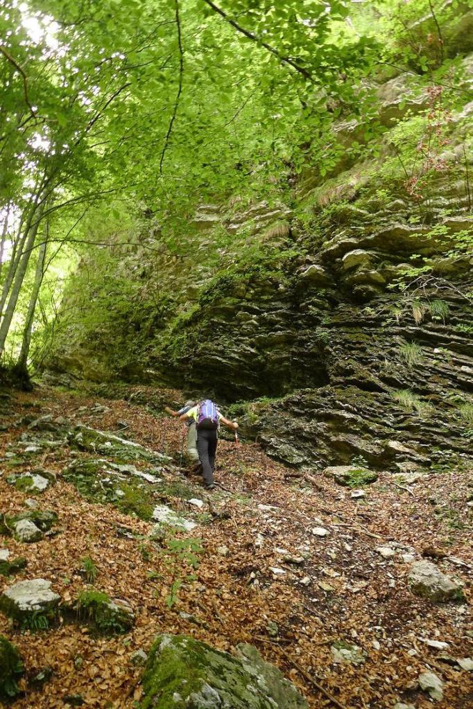 Desde el aparcamiento (1045m) continuamos por pista, ruta 965, (en un ensanche, a nuestra izquierda, una gran cruz y una bandera), que se convierte en senda (1215m 0h24′), siempre con mucha pendiente. Primero por bosque, luego en terreno herboso. La senda está casi cubierta de vegetación pero se sigue son problemas.