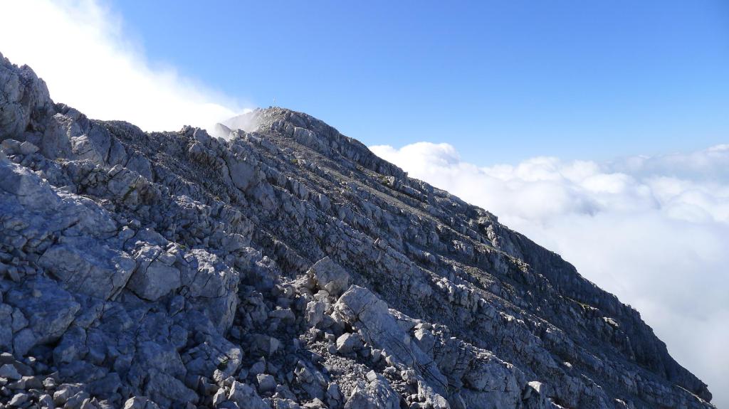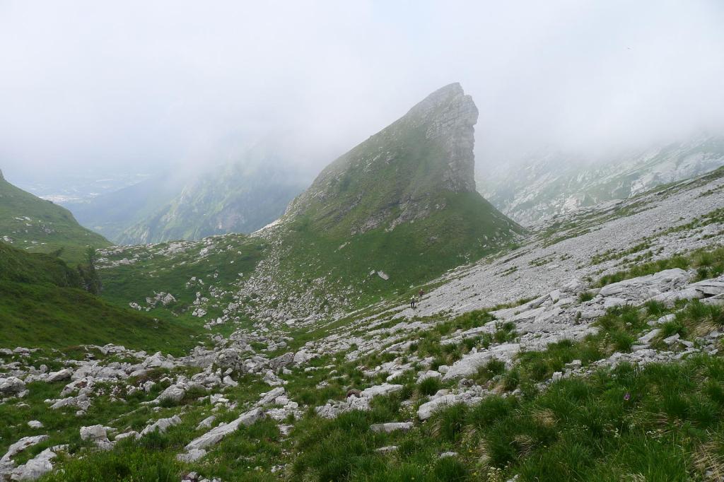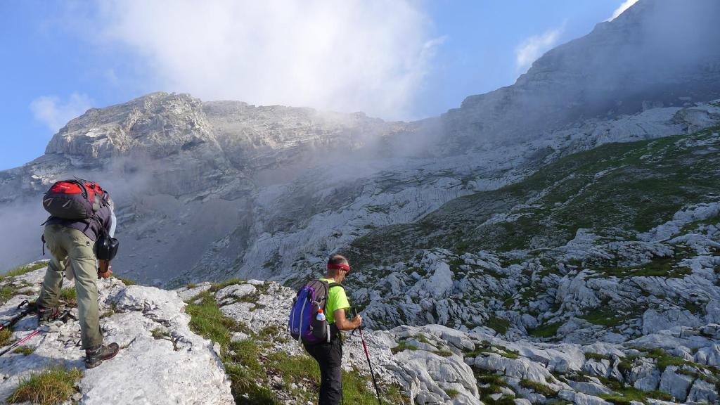 En la base de la Pala di Castelo, sobre unos lomos calizos, dejamos la senda y giramos hacia el norte por el karst hacia el collado SW de nuestro pico que se ve momentáneamente entre las nubes. Encontramos un camino (2255m 2h23′) que nos permite ascender por la glera de piedrilla, incómoda pero al menos con hitos, hasta la cresta (2445m 2h43′), junto a la Forcella Bassa del Col di Nudo.