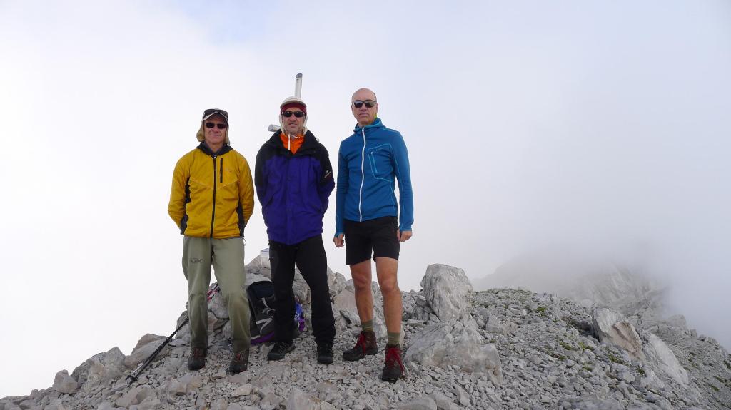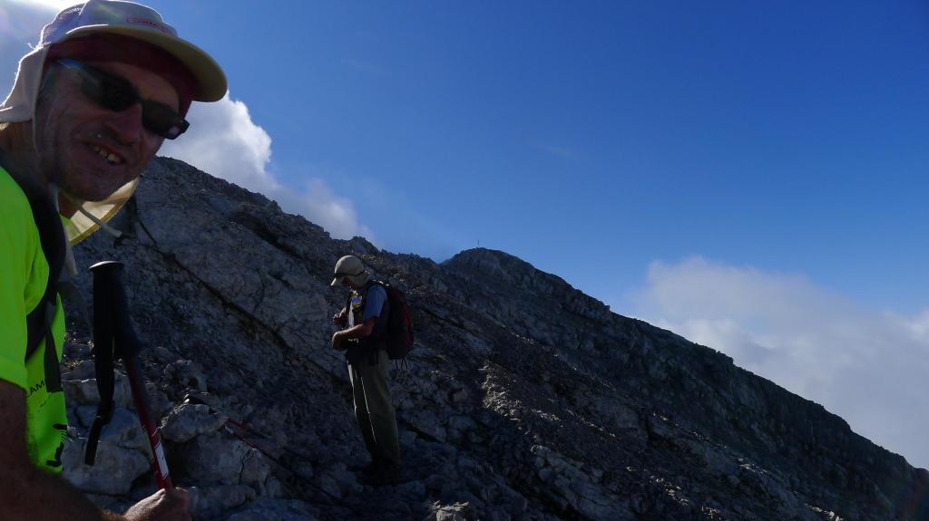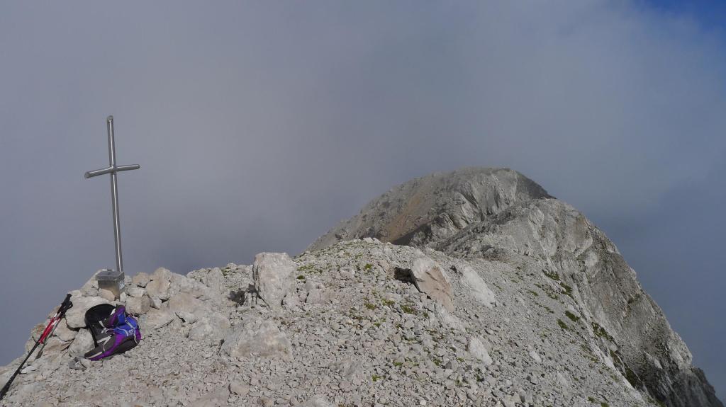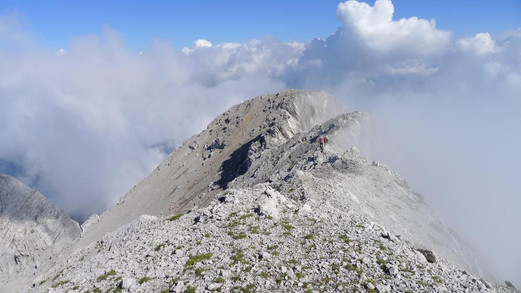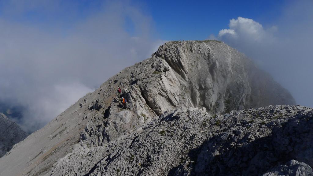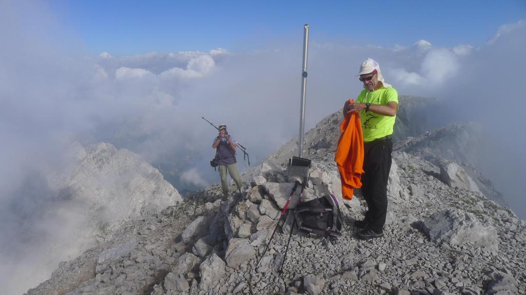 Paredes verticales en la otra vertiente y nubes que vienen y van; alcanzamos una primera cota, bajamos una brecha y subimos a la cima del Col di Nudo (2471m 2h50′).