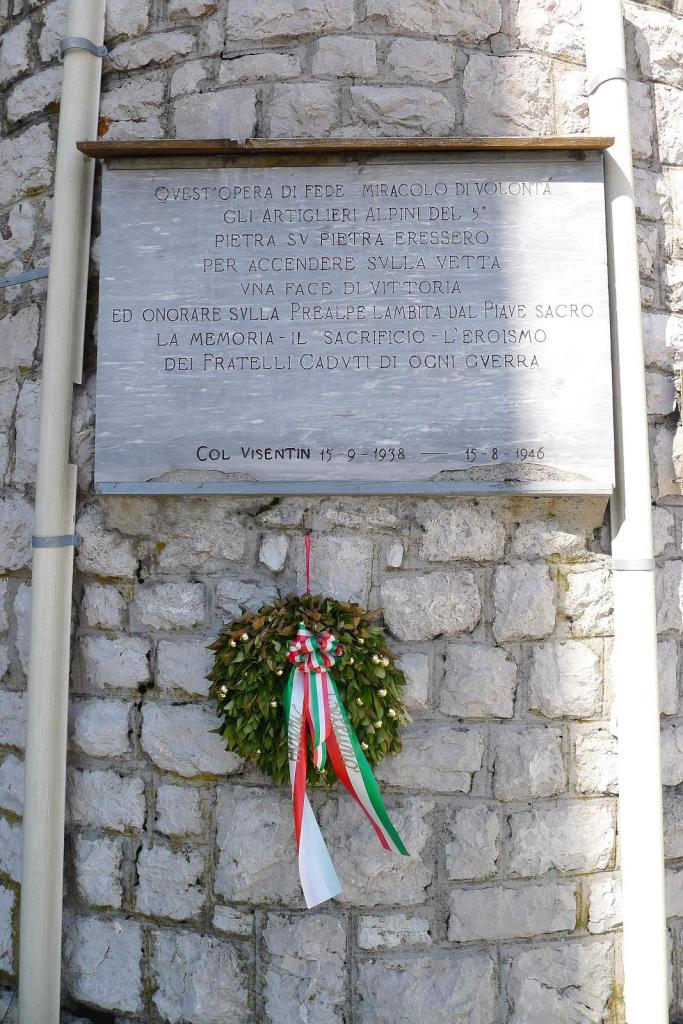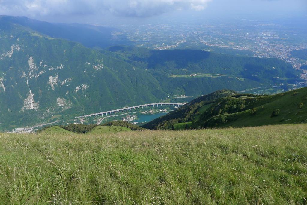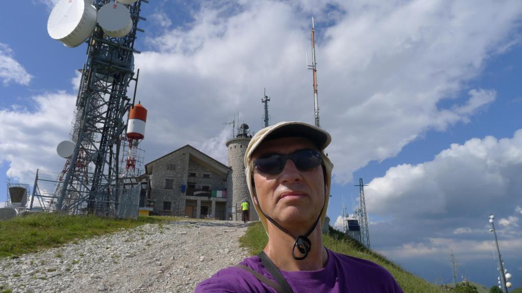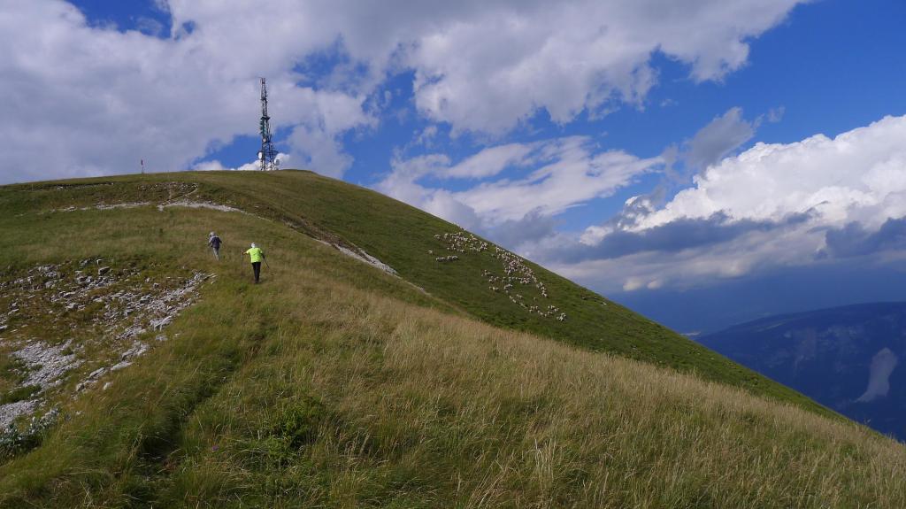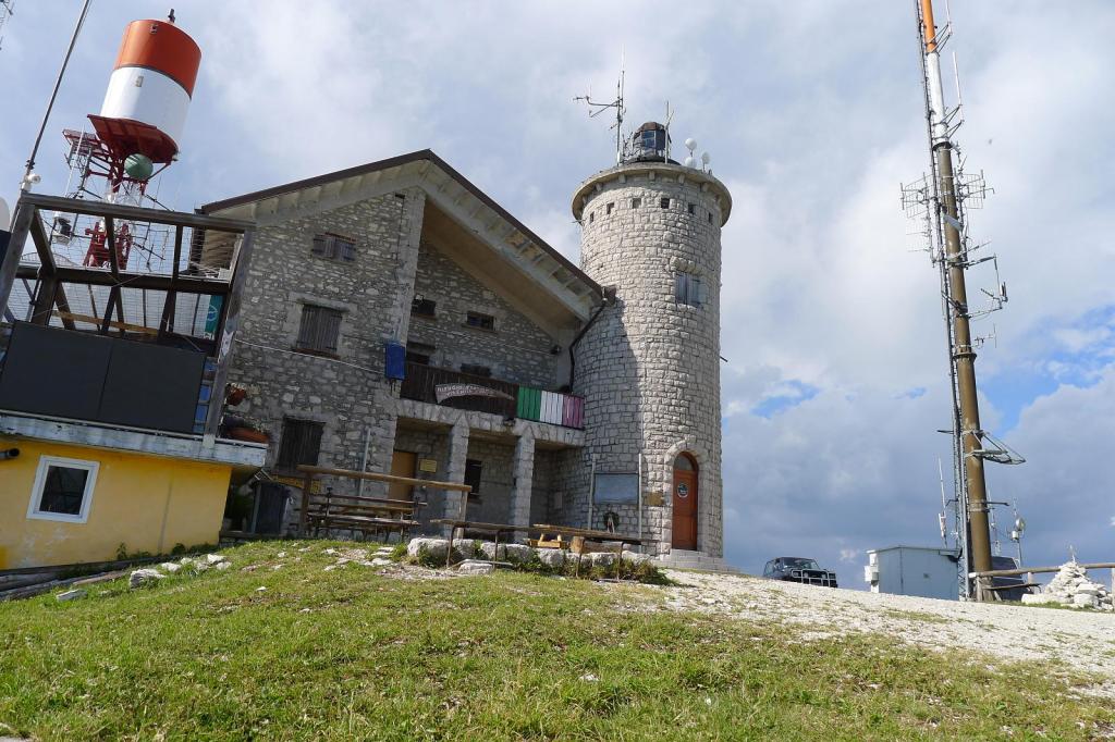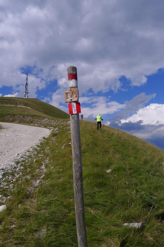 Subimos en coche por una pista hasta el aparcamiento en Forcella Zoppei (1420m), y seguimos andando, también por pista, por los lomos herbosos de la cresta sur del pico, señalizado como ruta E7. Tomamos algunos atajos, marcados con hitos, para llegar a la cima del Col Visentin (1776m 0h36′), donde se sitúa el refugio y antenas de comunicación, con una amplia vista, a pesar de que la tarde es brumosa.