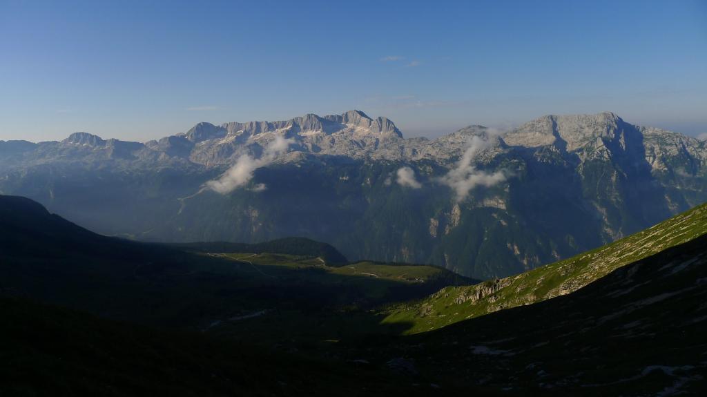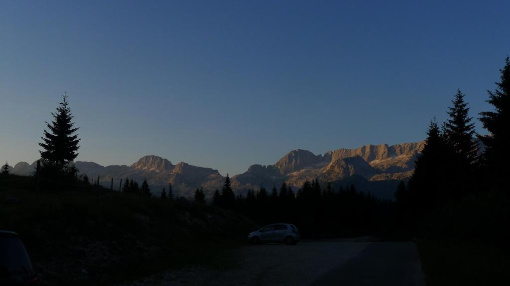 El Jôf di Montasio, en la provincia de Udine, es la 2ª cima en altitud de los Alpes Julianos (la 1ª es el Triglav). El austriaco Herman Findenegg fue el primero en alcanzar su cumbre en 1877. Desde Sella Nevea una estrecha carretera asciende hacia el WNW a las praderas de un resalte por encima del profundo valle del torrente Raccolana. Entre campos ganaderos vallados hay una zona de aparcamiento. Al sur las primeras luces del amanecer iluminan el macizo del Kanin. Nosotros nos centramos en las imponentes y aparentemente inaccesibles murallas del Montasio. Sabemos que hay una vía equipada que podemos afrontar, vamos a por ella. Seguiremos siempre las señales de pintura con un punto rojo que balizan la ruta.