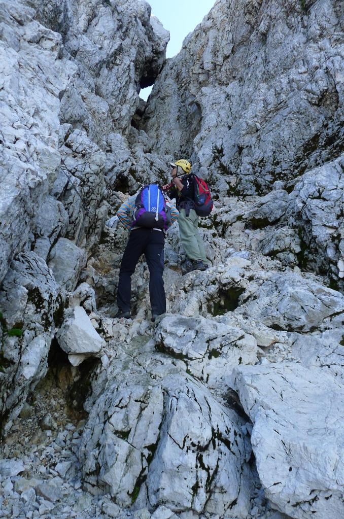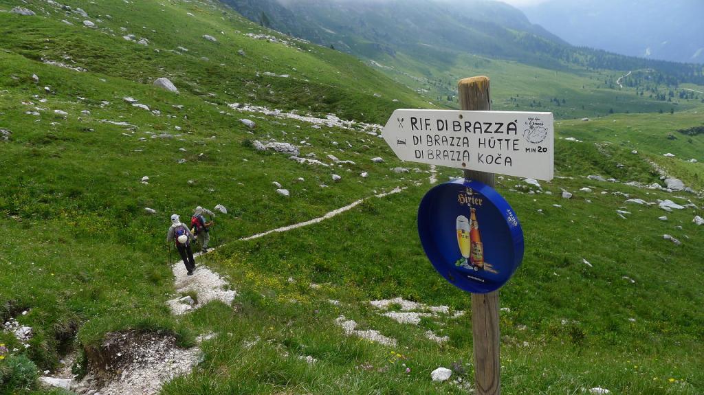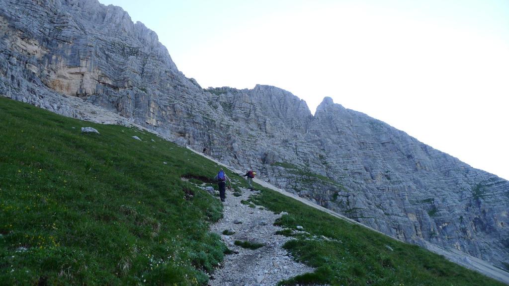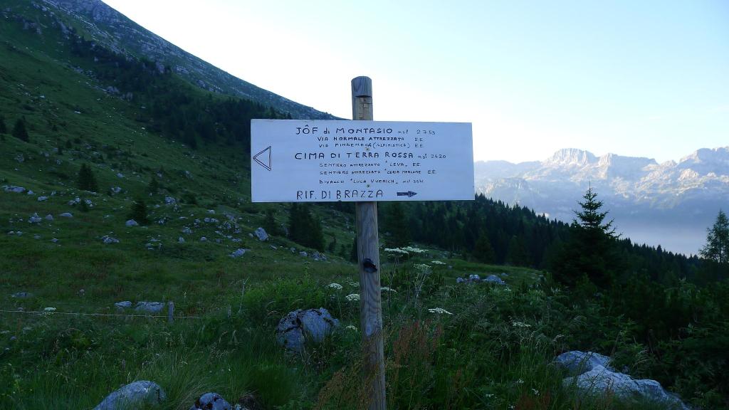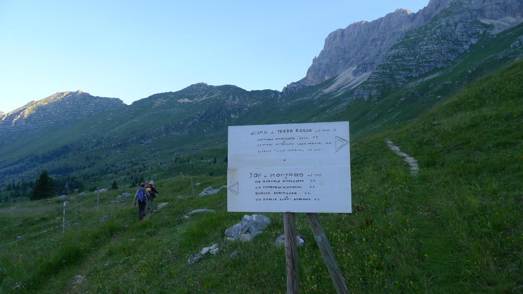 Desde el aparcamiento (1500m) sale una pista (NE) hacia el refugio di Brazza. Dejamos la desviación al refugio (1665m 0h27′) a la derecha y otra desviación más a la derecha a Cima di Terra Rossa, nosotros seguimos los carteles al Jôf di Montasio hacia la izquierda por sendas sobre zona de pastos. Más arriba otra bifurcación a la izquierda (1845m 1h01′). La senda es muy clara. Algunas marmotas asoman su cabeza a nuestro paso. Nos dirigimos a un collado herboso a la izquierda de la pared del Montasio y a la derecha de una pequeña formación rocosa de afiladas agujas.