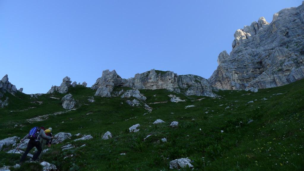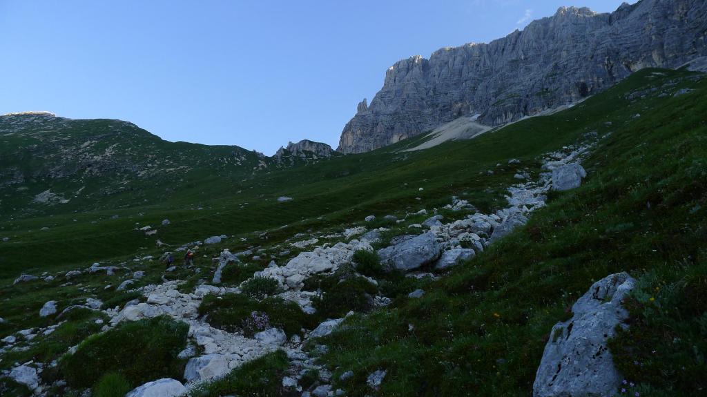 Llegamos al collado Forca Disteis (2200m 1h41′), donde pastan unos rebecos, y retrocedemos un poco para seguir la senda a la derecha (E) que atraviesa la pedrera bajo la pared, hasta alcanzar finalmente la roca (2250m 1h49′). Hay una placa. Nos abrochamos el casco y guardamos los bastones en la mochila. Superamos un par de pasos con sirgas y grapas. El terreno requiere atención, pero la ruta es clara y no excesivamente difícil, aunque sí exigente físicamente.