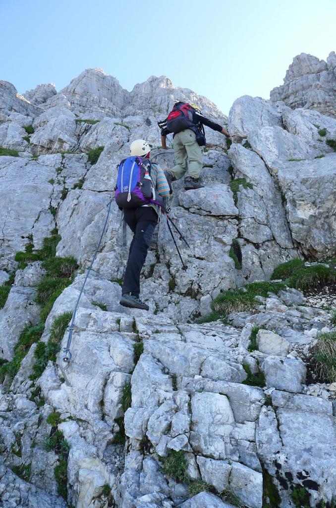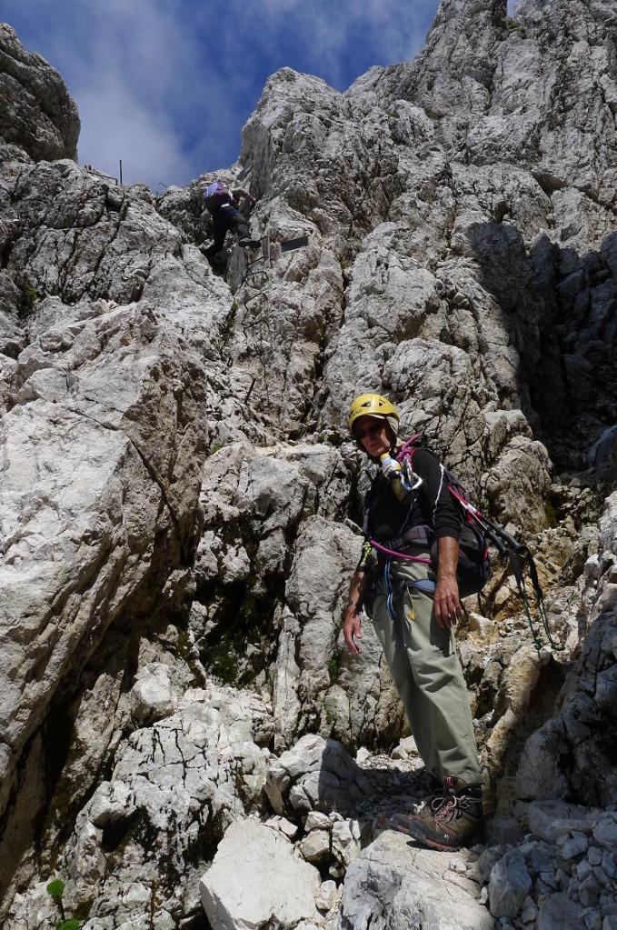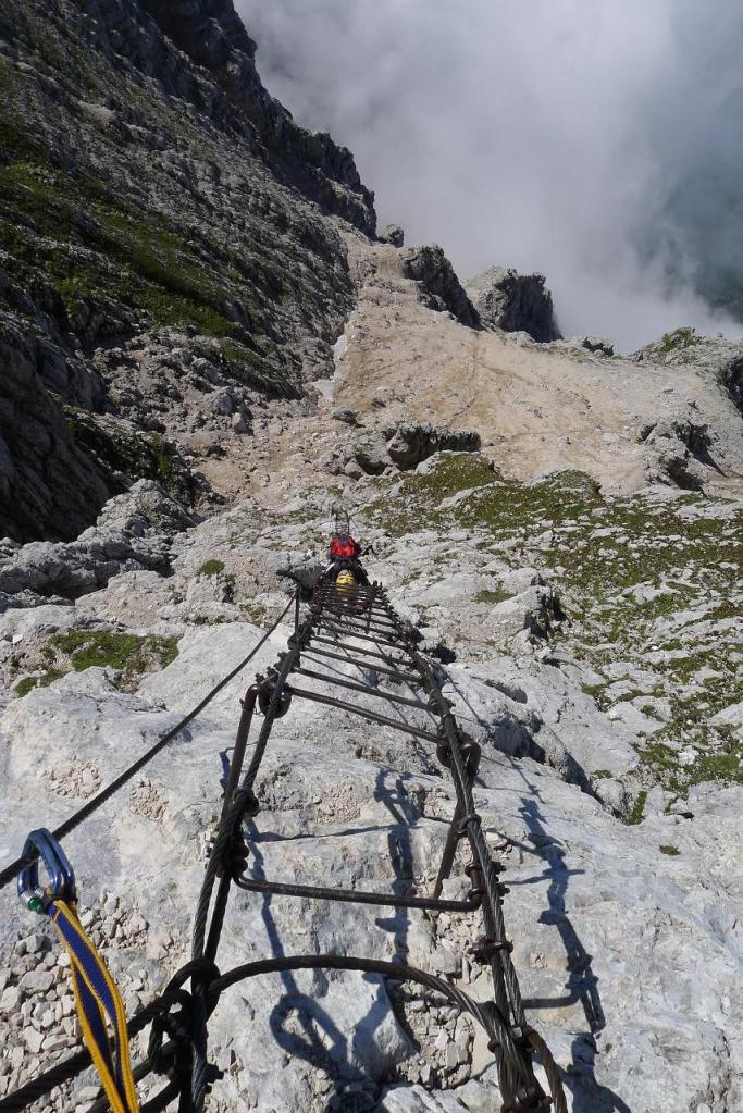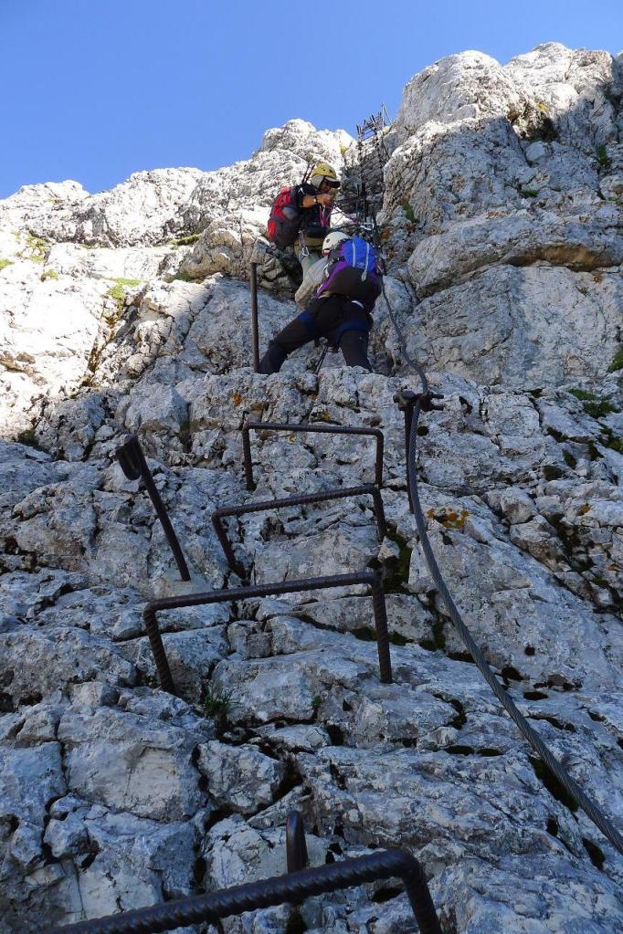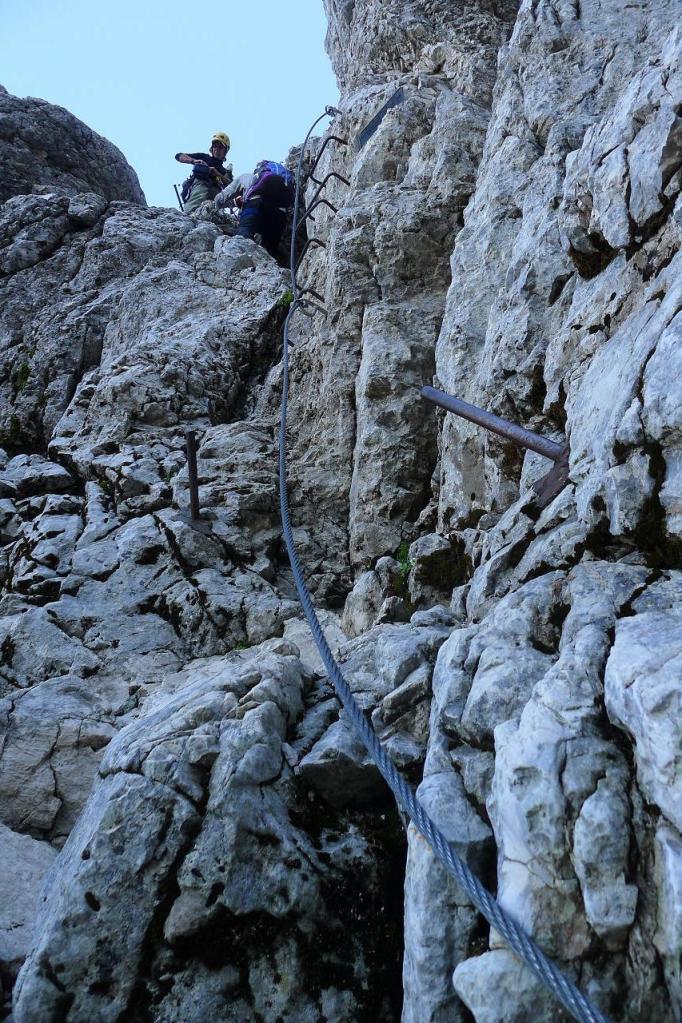 Por fin llegamos a la famosa Scala Pipan (2535m 2h36′), una escalera vertical de unos 70m que nos permite superar un gran muro y donde ya usamos el arnés y el disipador para asegurarnos a la línea que recorre su lado derecho. Las vistas hacia abajo son espectaculares. Aún queda otro paso con grapas y unas cuantas gradas rocosas más para llegar a la cresta oriental.