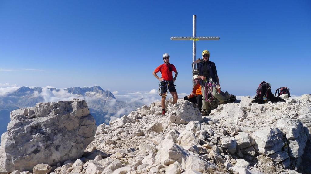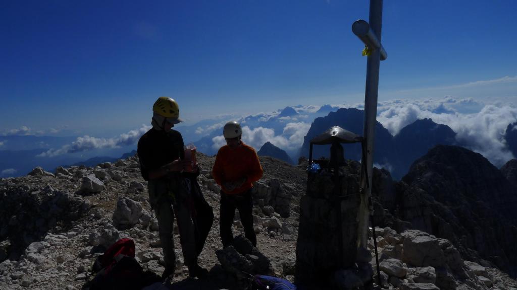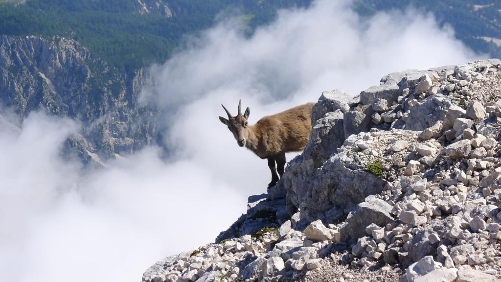 La cresta no es difícil, pero siempre con precaución, ya que la caída hacia ambas vertientes es impresionante, vamos avanzando hasta la cruz de la cima del Jôf di Montasio (2754m 3h25′). Picos rocosos y afilados y crestas espeluznantes nos rodean, las nubes van ascendiendo desde los valles, y algunos rebecos desafían la verticalidad acercándose hasta nosotros.