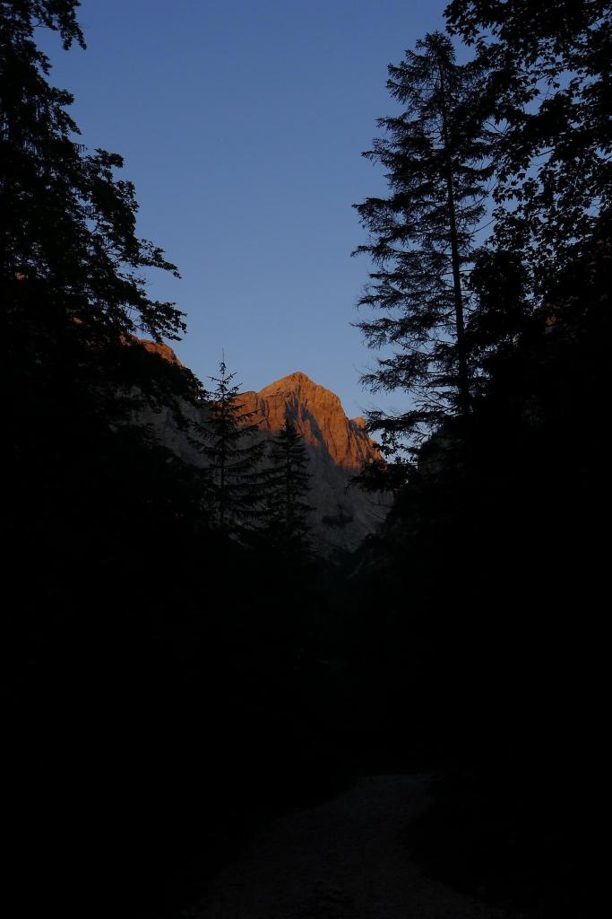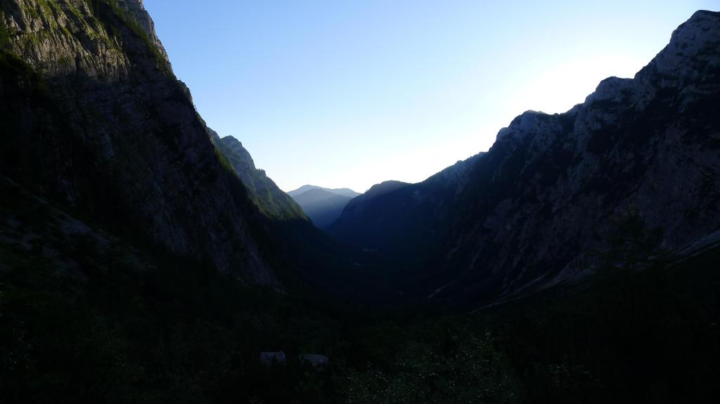 Empezamos a caminar a las 5h26′ (aparcamiento 950m). Una pista avanza por un bosque de hayas, arces y abetos hasta convertirse en sendero, cada vez más pendiente, por el fondo de un imponente valle glaciar. La vegetación se va haciendo más arbustiva hacia la cabecera del valle. En una bifurcación (1530m 1h25′) la senda principal va a la derecha, a la izquierda se va hacia el refugio Vodnikov.