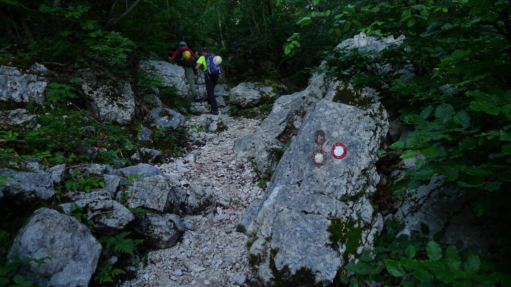 La mayoría de la gente divide la ascensión en dos etapas, haciendo noche en el refugio Planika; nosotros usaremos solo una jornada. La señalización, como en todas las montañas eslovenas, es un círculo rojo con centro blanco, también alguna raya roja y alguna cinta roja; se sigue con facilidad.