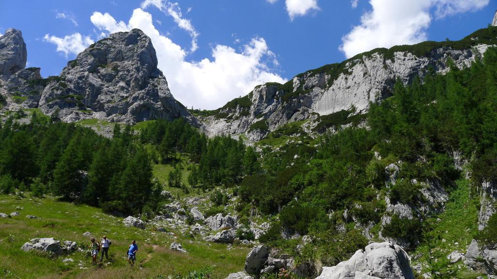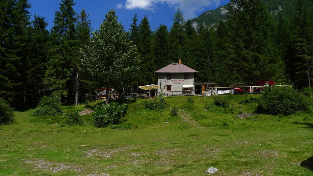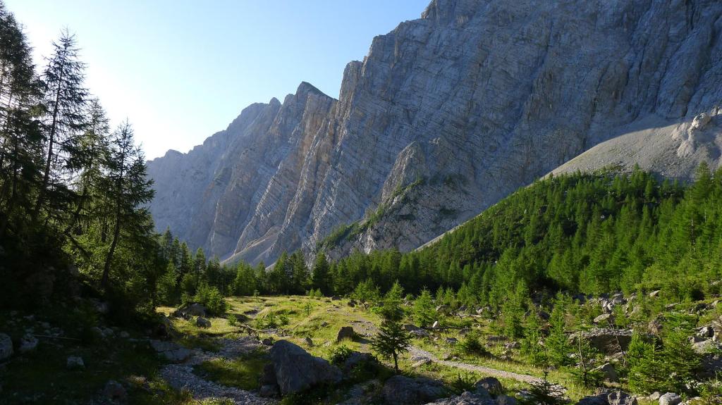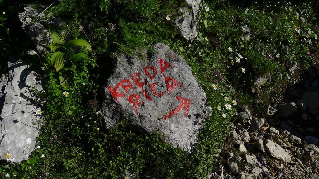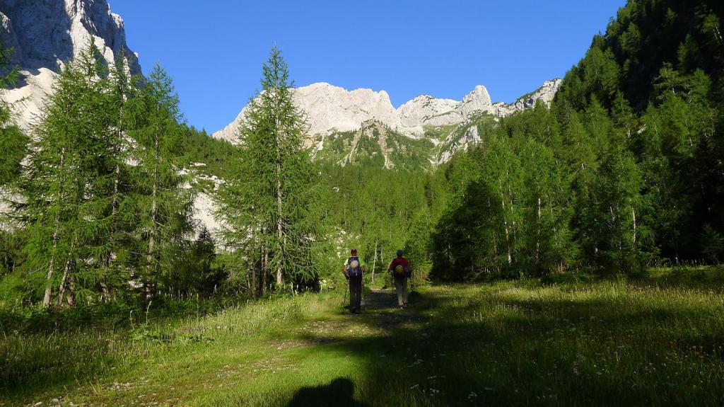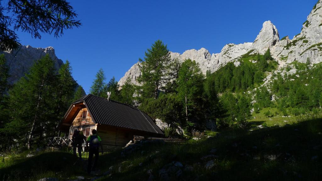 Se pasan unos prados más abiertos para llegar a una fuente y abrevadero (1570m 1h32′). Una subida en curva a la izquierda nos conduce Planina Zgornja Krma (1690m 1h46′) con una cabaña refugio. Se pasa otra fuente y desvío a la izquierda (1730m 1h55′), a la derecha se va al refugio Kredarica.