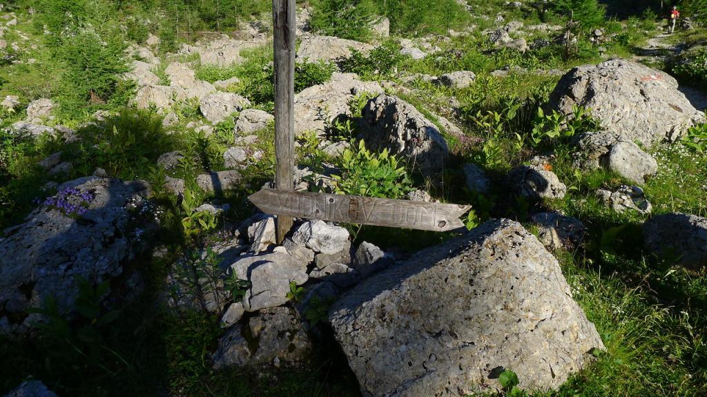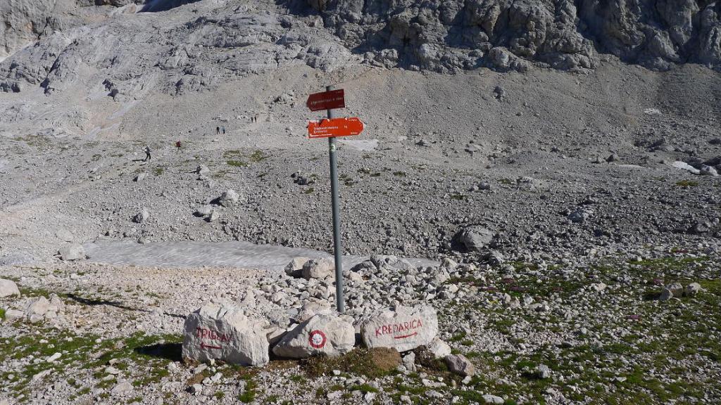 Se toma una canaleta rocosa bastante pendiente, el camino se vuelve rocoso y lleva al collado Konjsko Sedlo (2000m 2h27′), con un gran cartel que indica el cruce de caminos. Nosotros tenemos que seguir la dirección de Dom Planika.