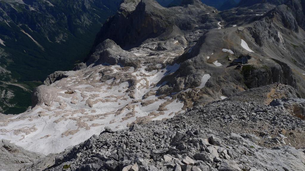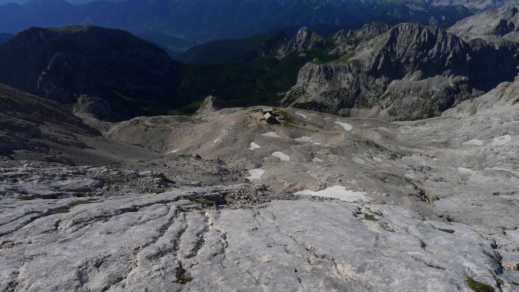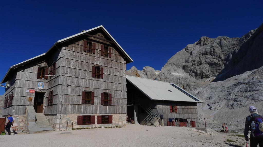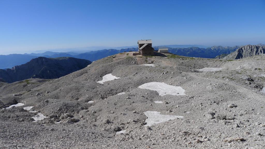 Una senda de tierrilla asciende con buena pendiente pero cómodamente pasando junto a una par de neveros. Y tras unos lomos pedregosos aparece el refugio Planika (2380m 3h14′). El Triglav está a la vista, comienza la parte más técnica con las paredes calizas que defienden la cima.