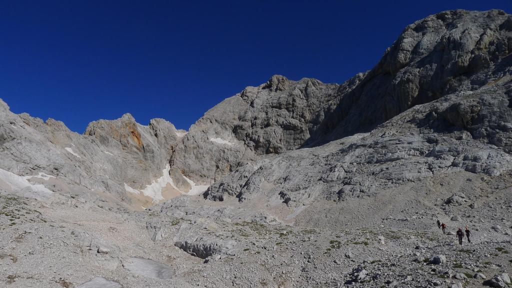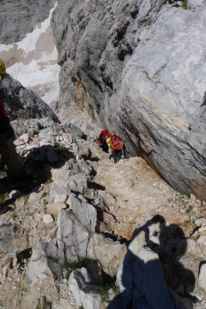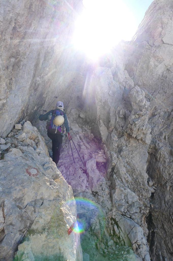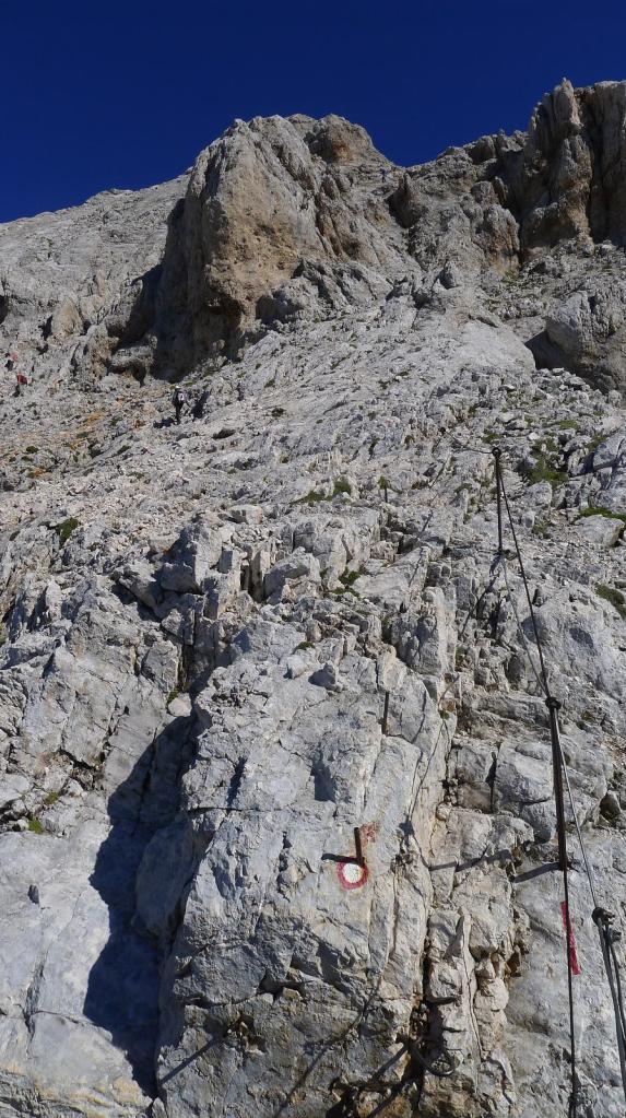 Junto al refugio, un cartel y unas piedras con pintura indican el camino, que se introduce en la ladera rocosa. La 1ª sirga (2260m 3h36′) asciende una estrecha chimenea. Plegamos los bastones, nos ponemos el casco. A partir de aquí todo está bastante equipado. Dejamos a la derecha el camino que viene del refugio Triglavski (2700m 3h58′).