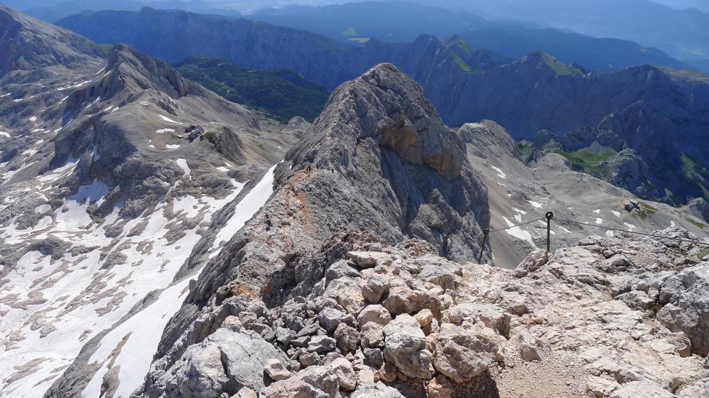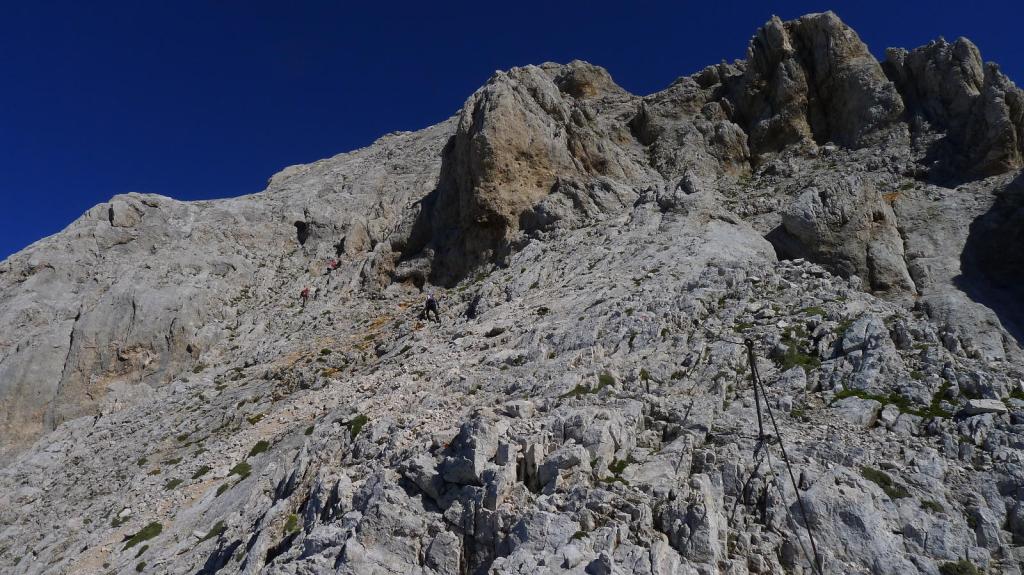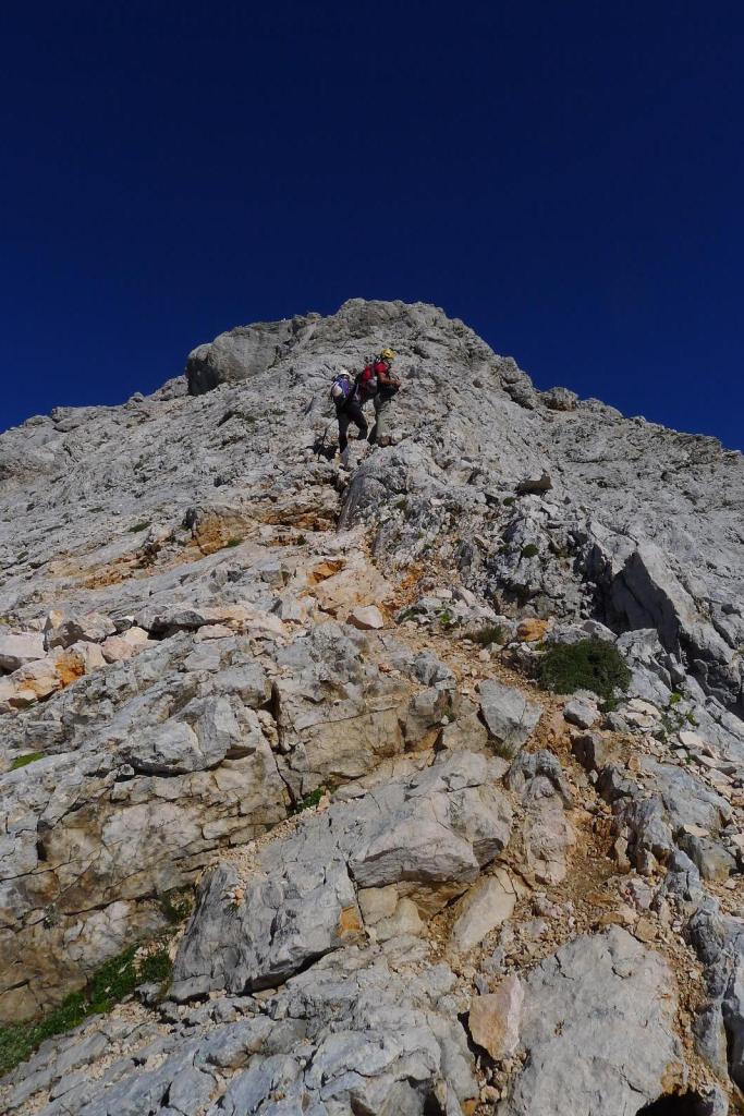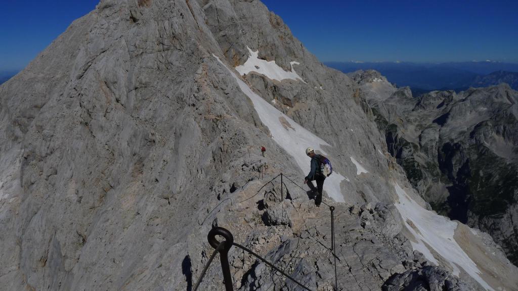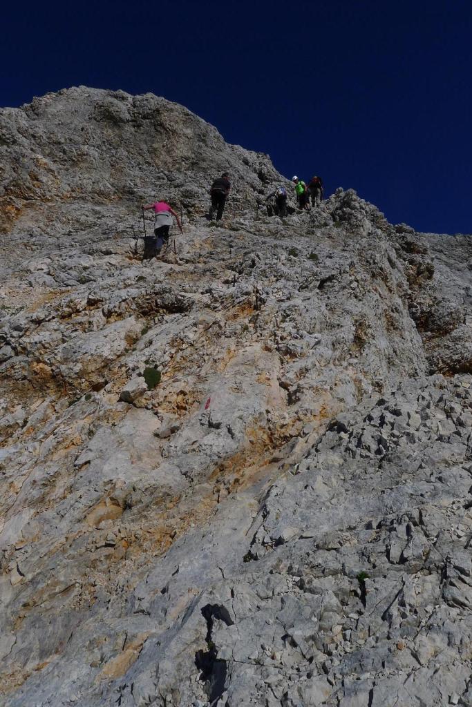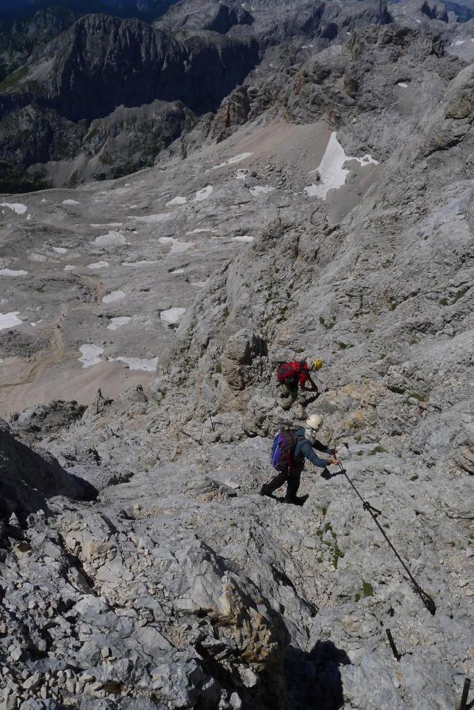 Estamos ya en plena cresta, la sirga sirve para agarrarse e ir más seguro, pero ningún paso es especialmente difícil. La pendiente es siempre exigente. Hay que superar la cumbre secundaria del Mali Triglav (2739m) para afrontar el último esfuerzo. Se acumula algo de tráfico en la cresta, 2 o 3 veces hay que parar para dejar paso, sobre todo a los que van atados a la sirga (mayoritatiamente grupos con guía). También hay gente que sube solo con casco, sin mochila ni nada.