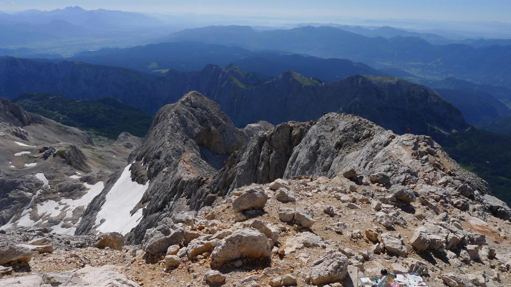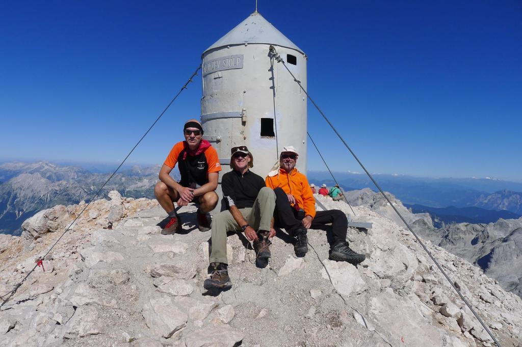 Cima del Triglav (2864m 4h27′), son las 9h53′ de la mañana. Hay bastante gente, pero tampoco es agobiante. La vista es espectacular, totalmente rodeados de profundísimos valles. Un día espléndido, cielo azul y sin viento. Sobre la cumbre un vivac metálico en forma de cohete, Aljazev Stolp ( la torre Aljaz) construída en 1895, como refugio por si hay tormenta.