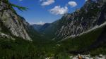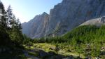 Empezamos a caminar a las 5h26′ (aparcamiento 950m). Una pista avanza por un bosque de hayas, arces y abetos hasta convertirse en sendero, cada vez más pendiente, por el fondo de un imponente valle glaciar. La vegetación se va haciendo más arbustiva hacia la cabecera del valle. En una bifurcación (1530m 1h25′) la senda principal va a la derecha, a la izquierda se va hacia el refugio Vodnikov.