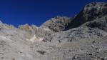 Una senda de tierrilla asciende con buena pendiente pero cómodamente pasando junto a una par de neveros. Y tras unos lomos pedregosos aparece el refugio Planika (2380m 3h14′). El Triglav está a la vista, comienza la parte más técnica con las paredes calizas que defienden la cima.