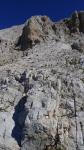 Junto al refugio, un cartel y unas piedras con pintura indican el camino, que se introduce en la ladera rocosa. La 1ª sirga (2260m 3h36′) asciende una estrecha chimenea. Plegamos los bastones, nos ponemos el casco. A partir de aquí todo está bastante equipado. Dejamos a la derecha el camino que viene del refugio Triglavski (2700m 3h58′).