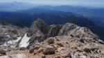 Cima del Triglav (2864m 4h27′), son las 9h53′ de la mañana. Hay bastante gente, pero tampoco es agobiante. La vista es espectacular, totalmente rodeados de profundísimos valles. Un día espléndido, cielo azul y sin viento. S0bre la cumbre un vivac metálico en forma de cohete, Aljazev Stolp ( la torre Aljaz) construída en 1895, como refugio por si hay tormenta.