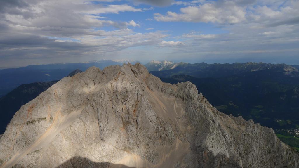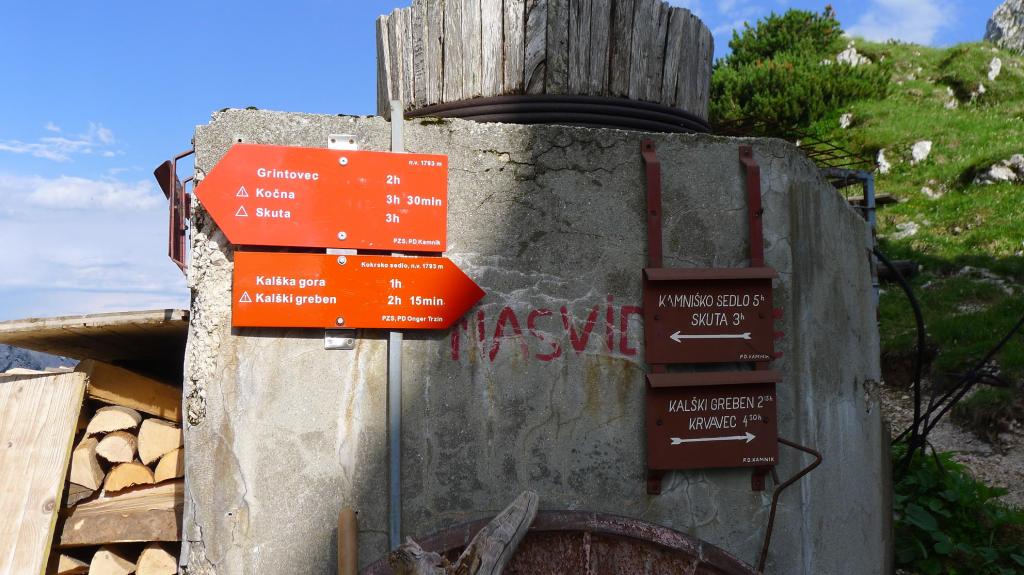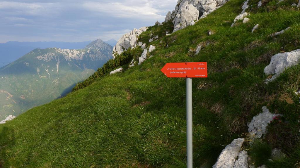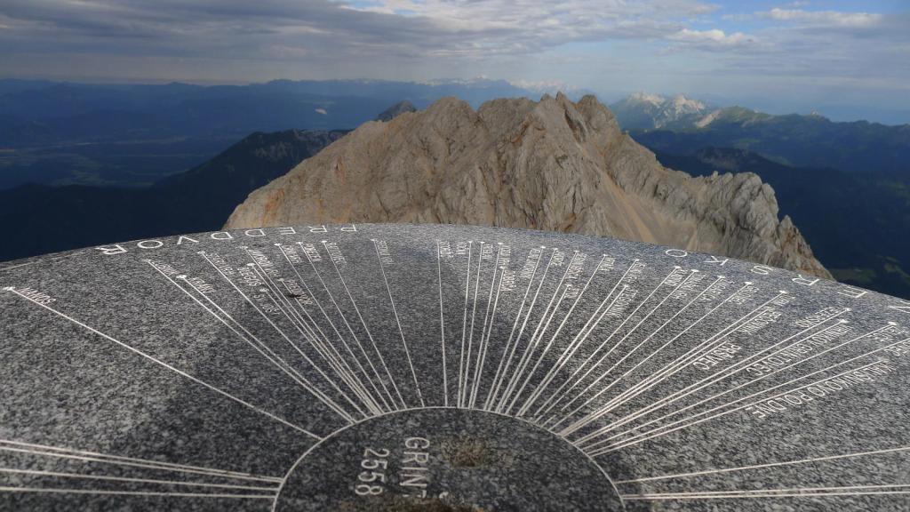 El cielo se está poniendo bastante negro, así que no perdemos tiempo. Enfilamos la arista (2345m 1h11′) hacia el norte y continuamos hacia la cima. Grintovec (2558m 1h30′). Hay una mesa de orientación y vistas de los picos Skuta al este y Kocna al oeste