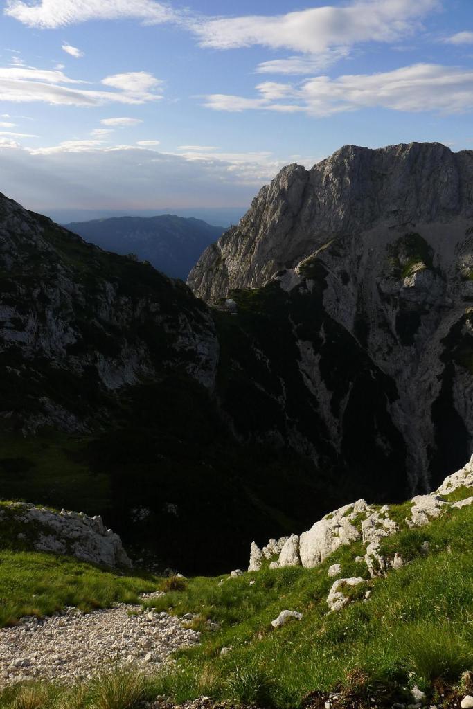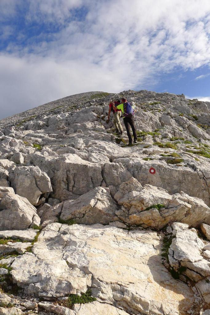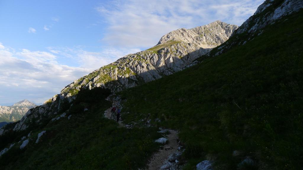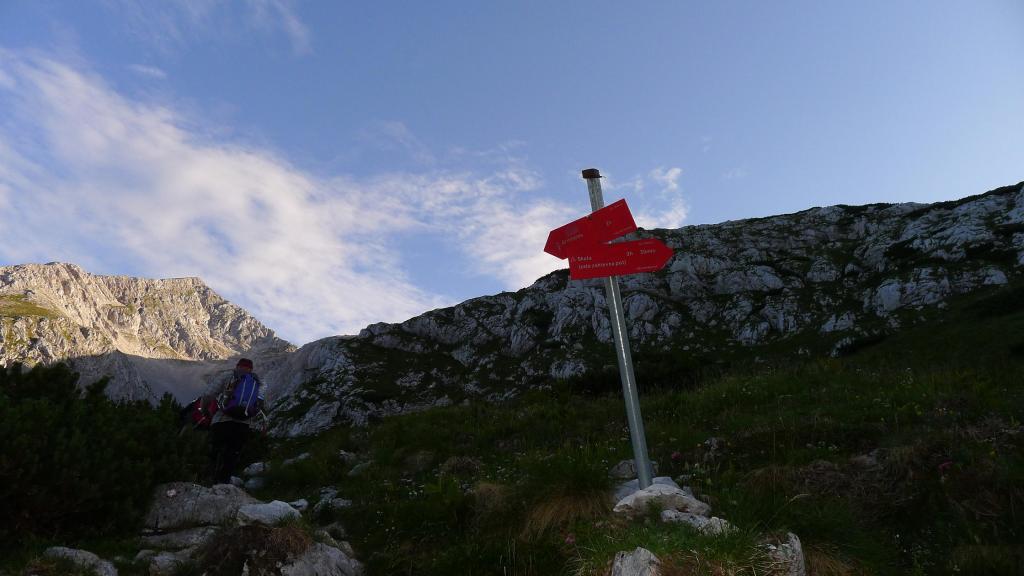Amanece con nubes y claros. Salimos del refugio (1793m) a las 6h30′, pero ya encontramos gente bajando. El camino es claro y está bien señalizado, sale hacia el N, bordea el resalte rocoso de nuestra derecha y luego se empina hacia arriba por la ladera de piedra y hierba. Dejamos a la derecha la desviación al Skuta (1855m 0h08′) y a la izquierda otra desviación al Kocna (2010m 0h37′).