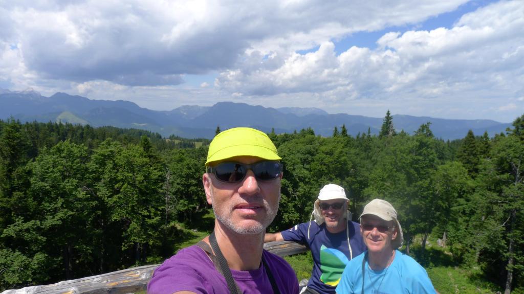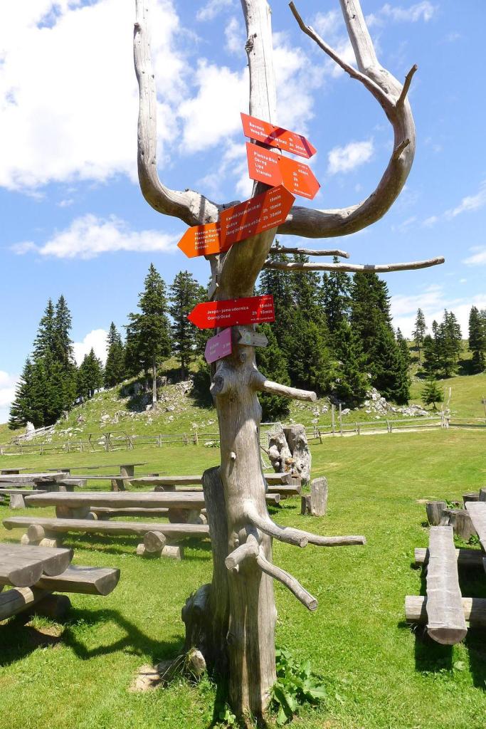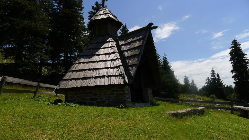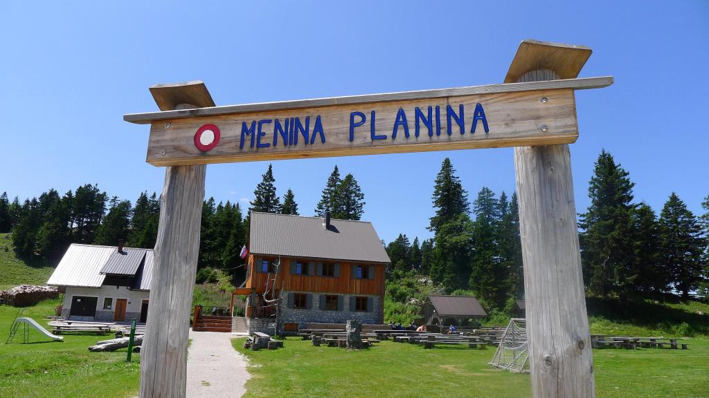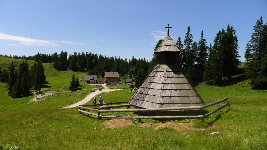 De camino tomamos una desviación que, por una pista de 12km se dirige a Menini Planini, donde hay un refugio, una gran área de campo con mesas y bancos como para hacer alguna fiesta o romería y una especie de pequeña iglesia o santuario de madera. El día es espléndido, comemos estupendamente en el refugio y hay bastante ambiente de eslovenos, nada de turistas.