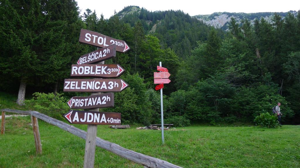 En Valvasorjev Dom (1180m) se inicia el camino señalizado con carteles por un frondoso hayedo-abetal. Seguimos un desvío a la izquierda (1195m 0h17′) y, tras una granja con caballos que queda a la derecha, otra bifurcación a la izquierda.