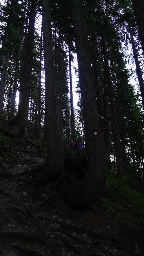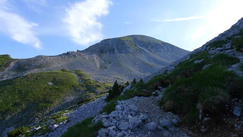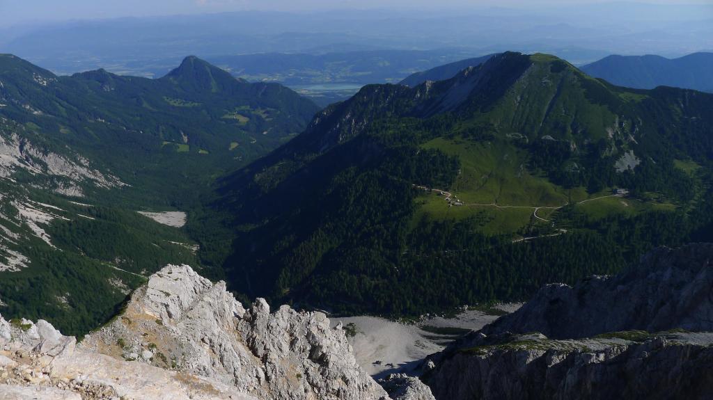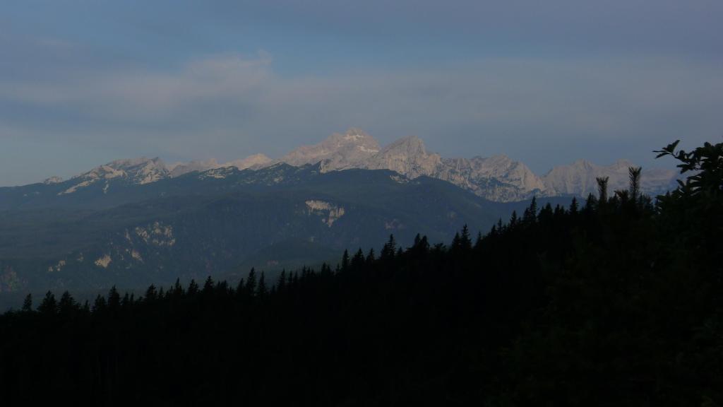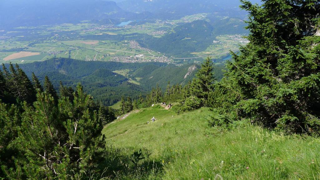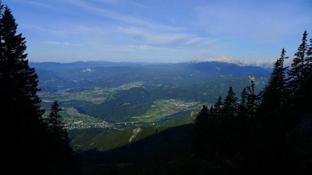 El sendero asciende con fuerte pendiente por la ladera. Tenemos buenas vistas del valle y del macizo del Triglav. Hay una zona de descanso con bancos de madera y un mirador (Priznica 1630m 1h00′). El bosque se aclara, dando paso al matorral y luego a los pastos.
