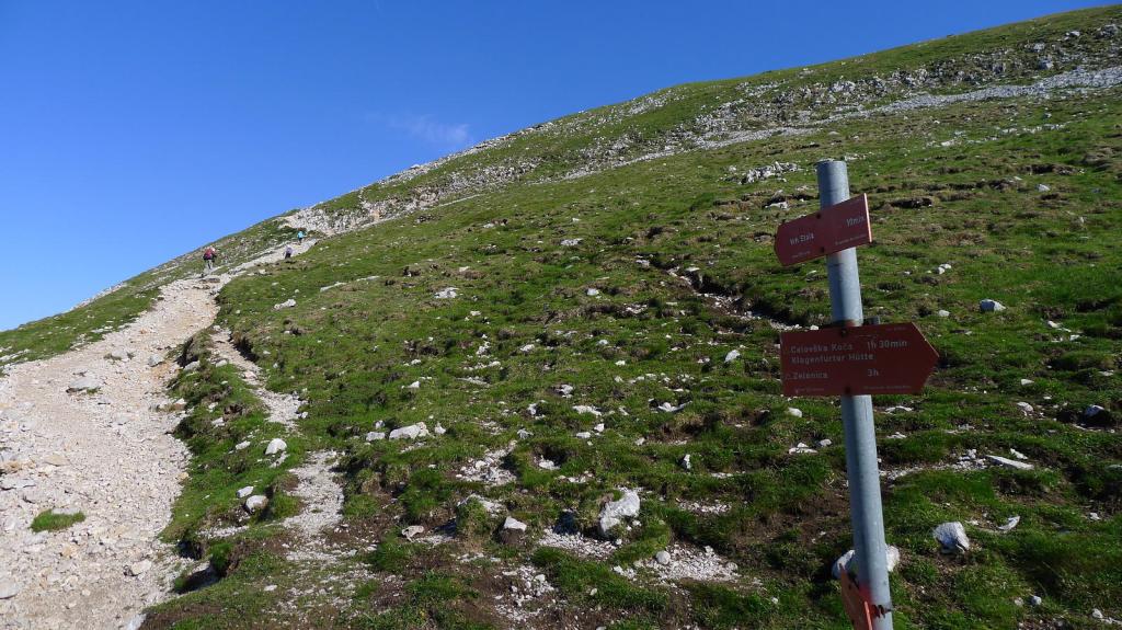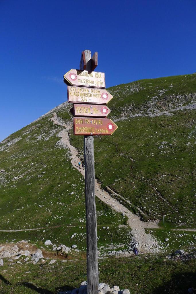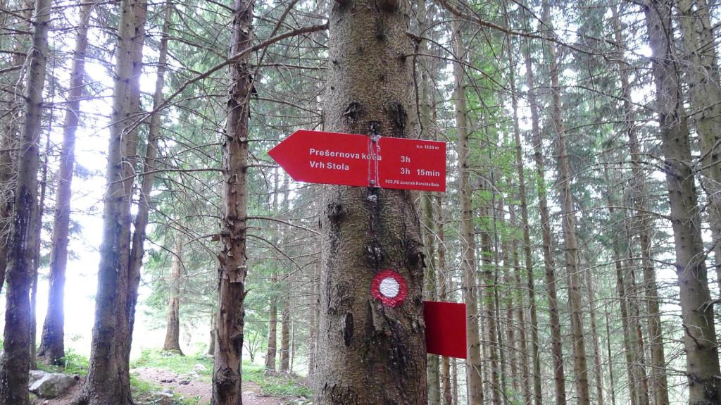 Tomamos un desvío a la derecha (1950m 1h49′) hacia el refugio. En el descenso bajaremos directos a este punto desde el Stol, sin pasar por el refugio. Al refugio Presernova (2155m 2h01′), situado sobre el lomo del Mali Stol, llegamos enseguida y, desde allí, se desciende al collado (2145m 2h08′) al NE del Stol, donde hay un cruce de caminos.