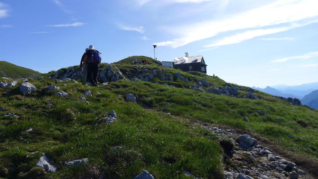 Antes de llegar de nuevo al collado, un camino pedregoso desciende por la vaguada al punto donde nos habíamos dirigido al refugio. El resto del descenso es la misma ruta que la subida. Ya en el refugio Valvasorjev (1180m 4h13′) comemos y descansamos en una terraza muy agradable.