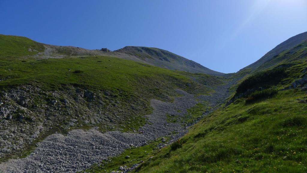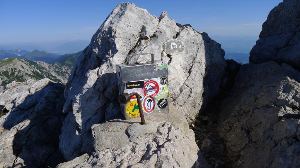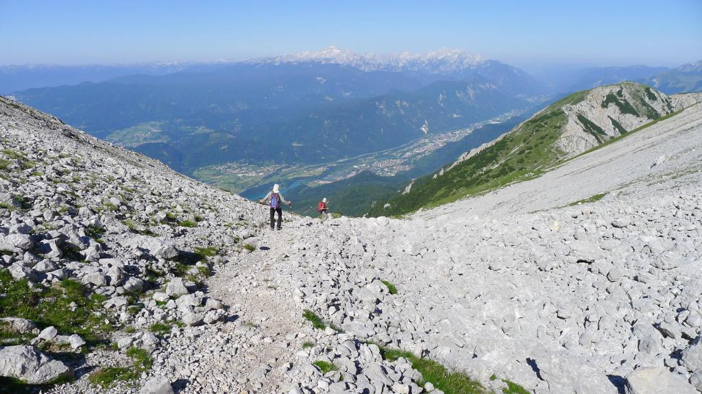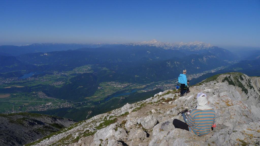 Solamente una ladera con buen camino nos separa de la cima del Stol (2225m 2h16′). Dominamos el valle del Sava, en Eslovenia, y una caída vertical con grandes corredores hacia Austria.