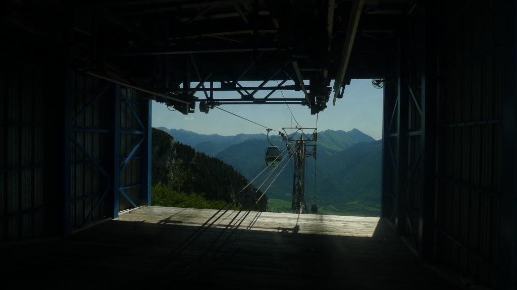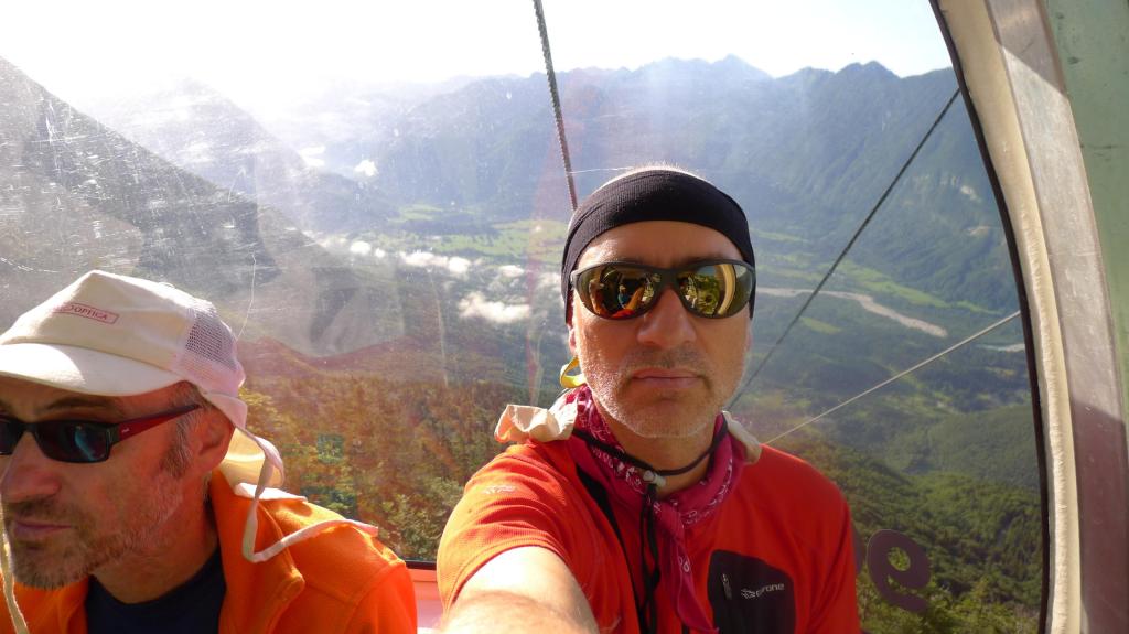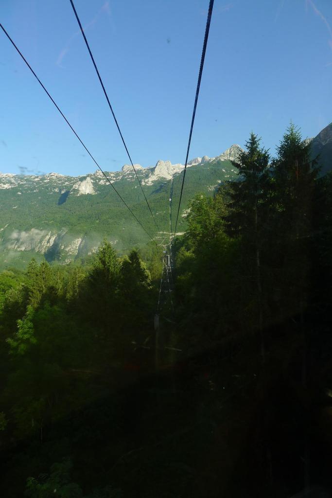 Un teleférico que se toma en la salida SW de Bovec nos permite una rápida aproximación. El primer viaje sale a las 7h00′ y cuesta 17 euros; allí estamos como clavos. La siguiente salida es a las 8h00′ y ya continuamente hasta las 17h00′. Salva casi 1800m de desnivel (desde 430m hasta 2180m) en un viaje de 45′ sobre el dosel de un bosque extraordinario.