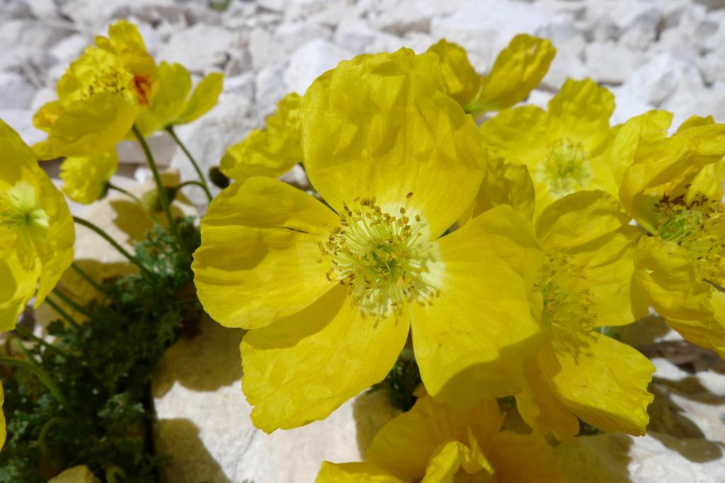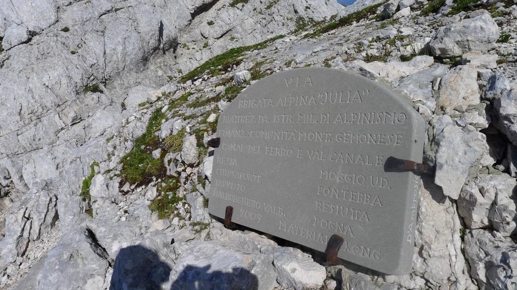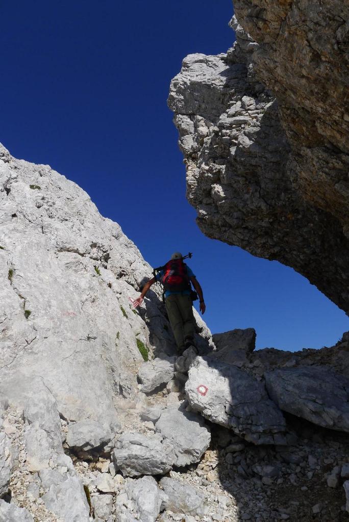 Llegamos a la cumbre del Kanin (2587m 1h47′). Magníficas vistas del Jôf di Montasio. Toda la montaña es un tremendo karst. Durante el descenso nos encontramos grupos subiendo a las 11 de la mañana, con un sol de justica, con pinta de no saber dónde se meten. Supongo que suben en el teleférico y piensan «pues vamos a subir al Kanin», sin mochila, sin agua y en zapatillas.