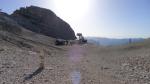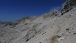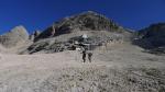Salimos del teleférico (2180m) a un impresionante desierto de roca y piedra. Seguimos unos altos y abundantes hitos. Hay una sirga para superar un resalte que da paso a una gran vaguada. Dejamos la desviación al refugio a la izquierda (2210m 0h08′). Más arriba hay otra desviación al refugio a la izquierda (2350m 0h31′). Seguimos flanqueando la gran vaguada o gran dolina por la glera.
