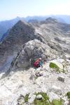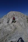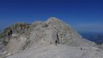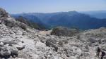 Llegamos a la cumbre del Kanin (2587m 1h47′). Magníficas vistas del Jôf di Montasio. Toda la montaña es un tremendo karst. Durante el descenso nos encontramos grupos subiendo a las 11 de la mañana, con un sol de justica, con pinta de no saber dónde se meten. Supongo que suben en el teleférico y piensan «pues vamos a subir al Kanin», sin mochila, sin agua y en zapatillas.