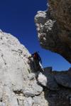 Entramos en plena pared de roca (2440m 1h06′) . Guardamos los bastones y avanzamos siempre con trepadas fáciles pero exigentes físicamente. Sirgas y clavos ayudan en los tramos más expuestos. La ruta va bordeando la cresta que queda a nuestra derecha (N), hasta que se accede finalmente a la cresta (2490m 1h18′) después de llegar a una brecha.
