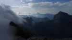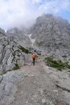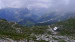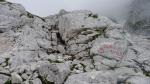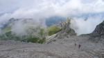 Mangart (2679m 1h38′). Hay poca visibilidad, las nubes pasan rápido y tenemos que abrigarnos bien. Aunque las referencias dicen que es una montaña muy frecuentada, nosotros solo encontramos un grupos de 4 personas.
