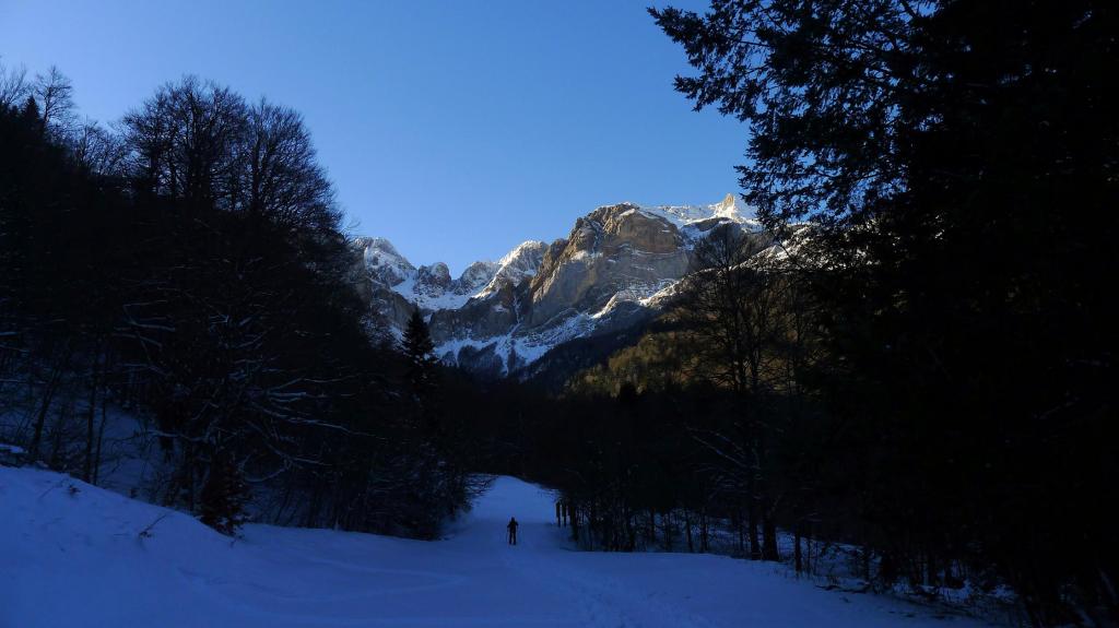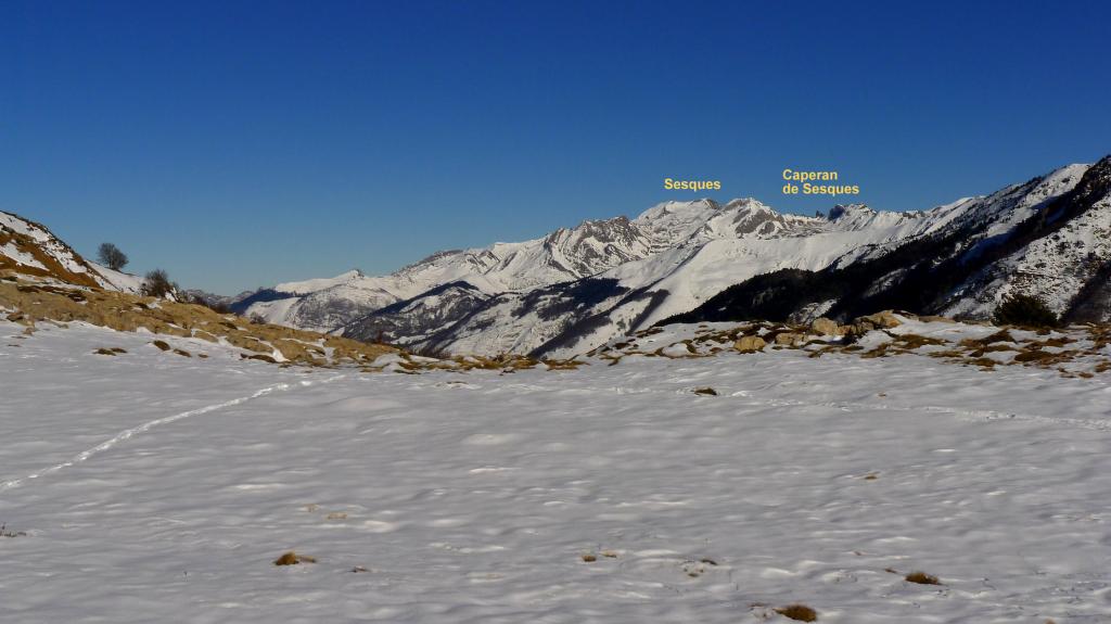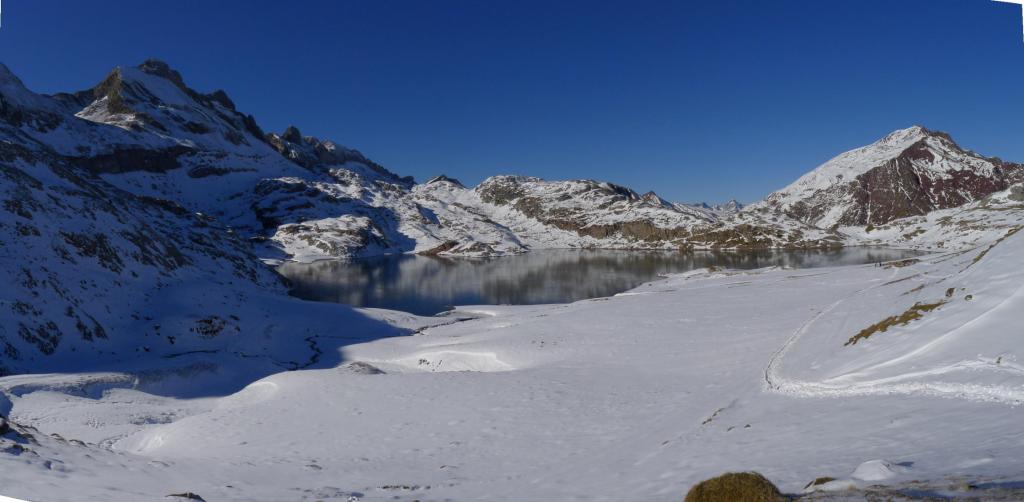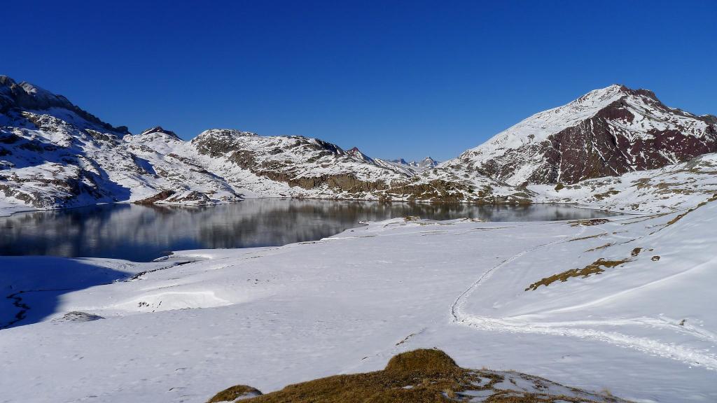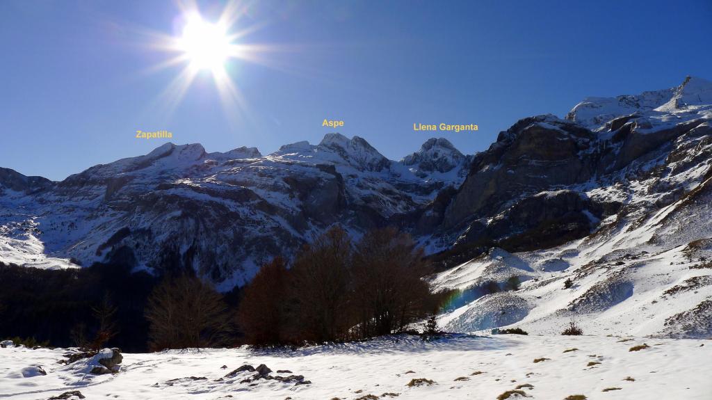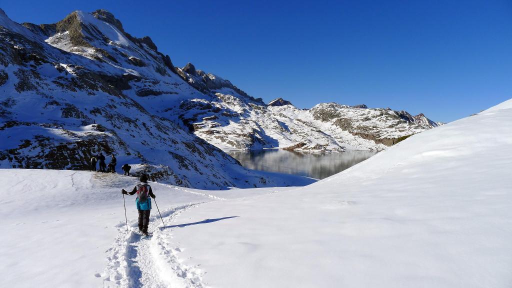 Desde Sansanet (1329m) el recorrido está bien señalizado y además hay una gran huella de paso de gente con raquetas, esquís o andando con botas. Llegamos al ibón de Estanés (1790m 2h00′) en medio de un magnífico paisaje. El descenso finalmente es más cómodo sin raquetas debido precisamente a lo pisada que está la huella.