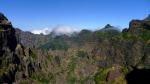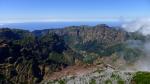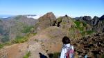 Esmeralda me acompaña hasta el collado (1550m 1h28′) que separa el pico Torres, al sur, y el Ruivo, al norte. Continúo solo porque creo que puedo hacer bastante rápido el tramo que me queda. Sin embargo todavía tengo que hacer una buena travesía hacia el N, subir al refugio Casa do Ruivo (1750m), y un repecho importante hasta la cumbre del Ruivo (1862m 2h13′). Sobre la cima hay una pequeña plataforma, el panorama es magnífico, las cordillera volcánica, los valles verdes, el mar.