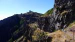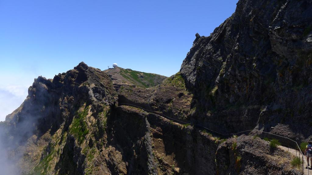 En el pico Areeiro (1812m) hay gran acumulación de coches y autobuses y, por supuesto de gente; algunos vienen solamente hasta aquí para disfrutar de las vistas, hay tienda, restaurante y unas instalaciones militares con una característica cúpula de comunicaciones. Se sale por la arista NW, fácil pero equipada con una sirga de protección, la razón es evidente, el viento sopla fortísimo y algunas rachas obligan a agarrarse.