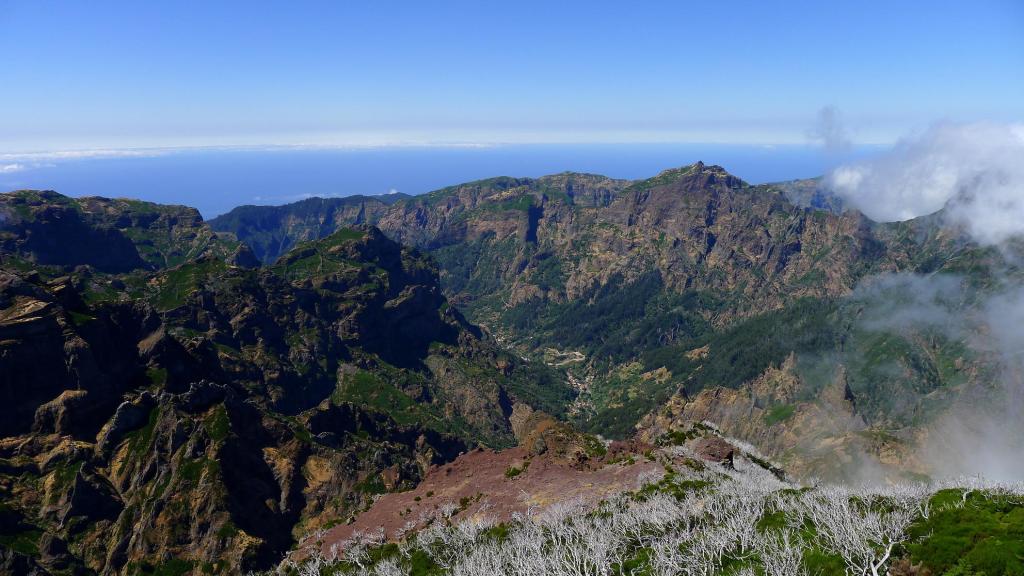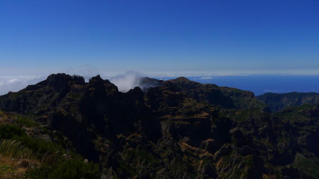 Esmeralda me acompaña hasta el collado (1550m 1h28′) que separa el pico Torres, al sur, y el Ruivo, al norte. Continúo solo porque creo que puedo hacer bastante rápido el tramo que me queda. Sin embargo todavía tengo que hacer una buena travesía hacia el N, subir al refugio Casa do Ruivo (1750m), y un repecho importante hasta la cumbre del Ruivo (1862m 2h13′). Sobre la cima hay una pequeña plataforma, el panorama es magnífico, la cordillera volcánica, los valles verdes, el mar.